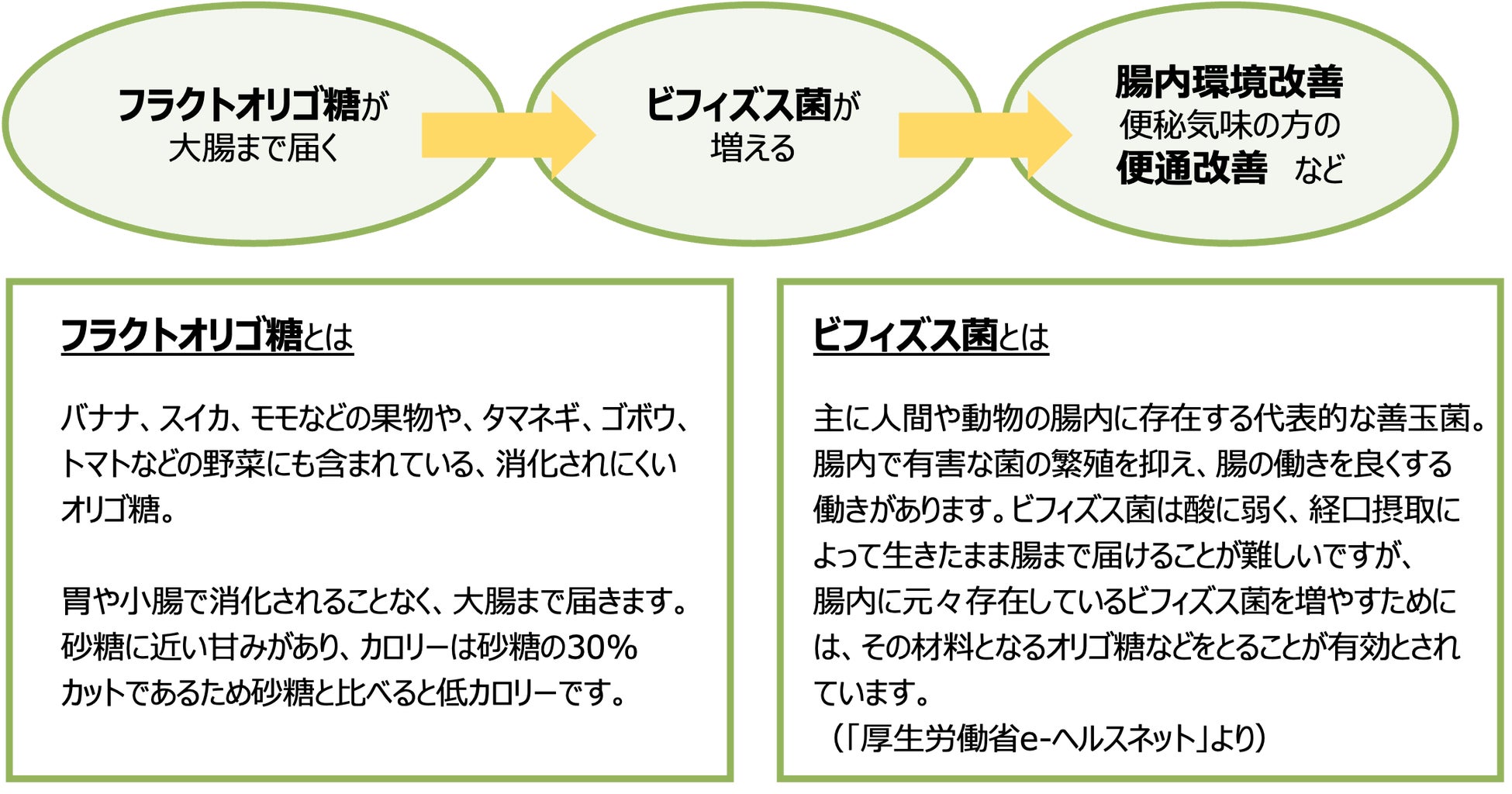 <機能性表示食品 届出表示>本品にはフラクトオリゴ糖が含まれます。フラクトオリゴ糖は、腸内の善玉菌であるビフィズス菌を増やし、腸内環境を改善し、便秘気味の方の便通を改善する機能があることが報告されています。(届出番号:J34)