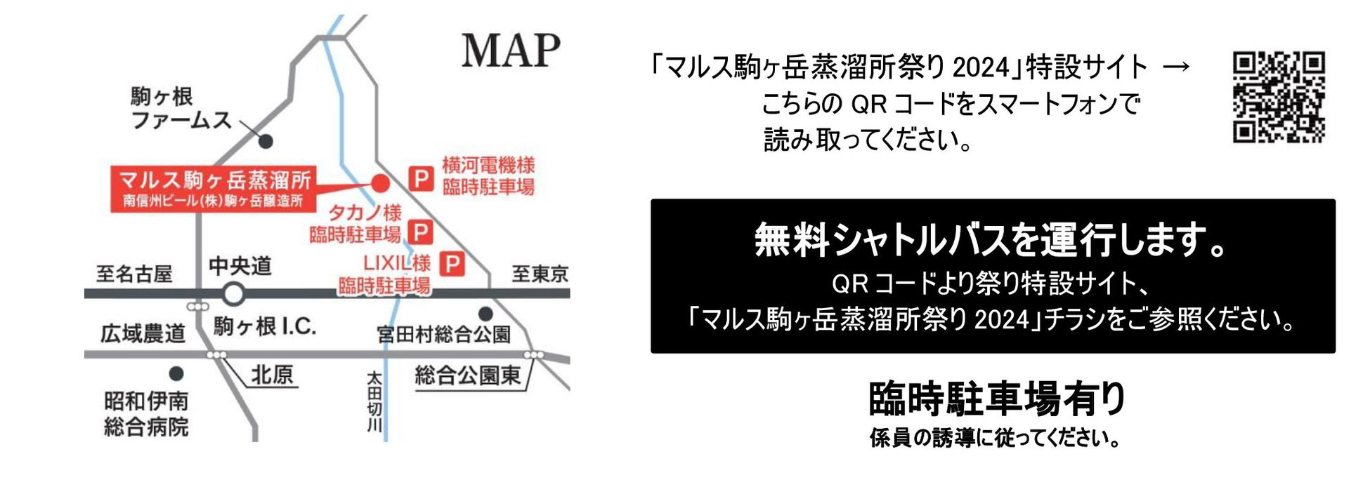 お酒を飲める方も飲めない方も楽しんでいただけますので、皆様お誘い合わせの上ご来場ください。詳しくは、下記QRコードより祭り特設サイト、「マルス駒ヶ岳蒸溜所祭り2024」チラシをご参照ください。