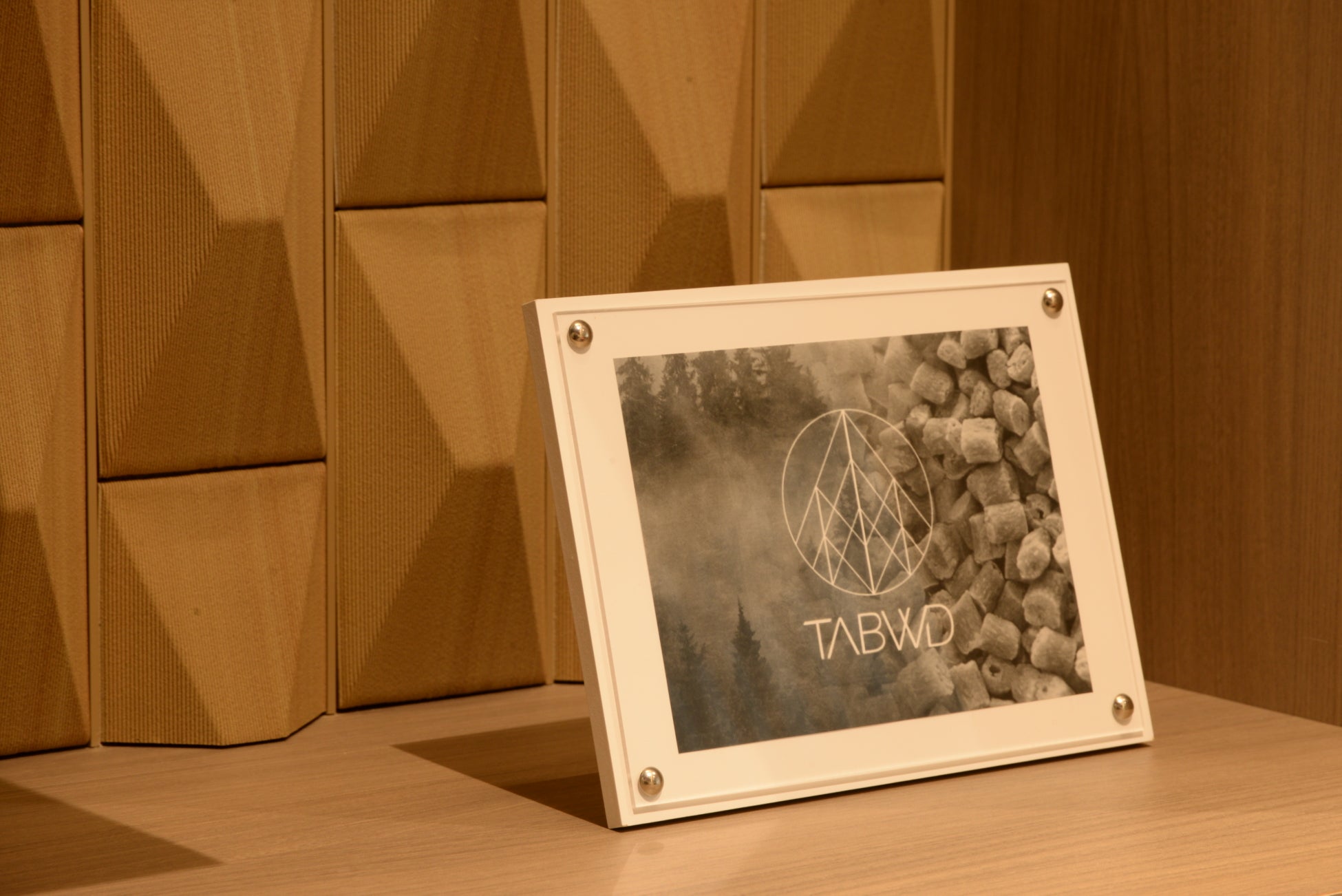 壁面装飾の材料は、トヨタ車体株式会社の開発した、スギの間伐材をプラスチックに配合した「TABWD®」を使用