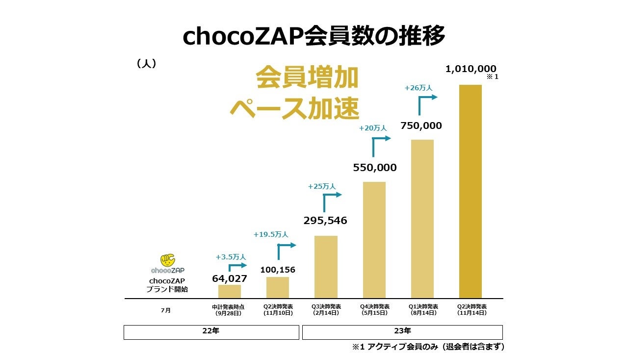 幅広いメディアでの大きな反響を頂く中、chocoZAPへの入会者は当初の計画を上回るペースで増加し続けており2023年11月14日時点の会員数は『101.0万人』となり、chocoZAPブランドを開始した2022年7月から約1年5ヶ月で、会員数100万人を達成いたしました。