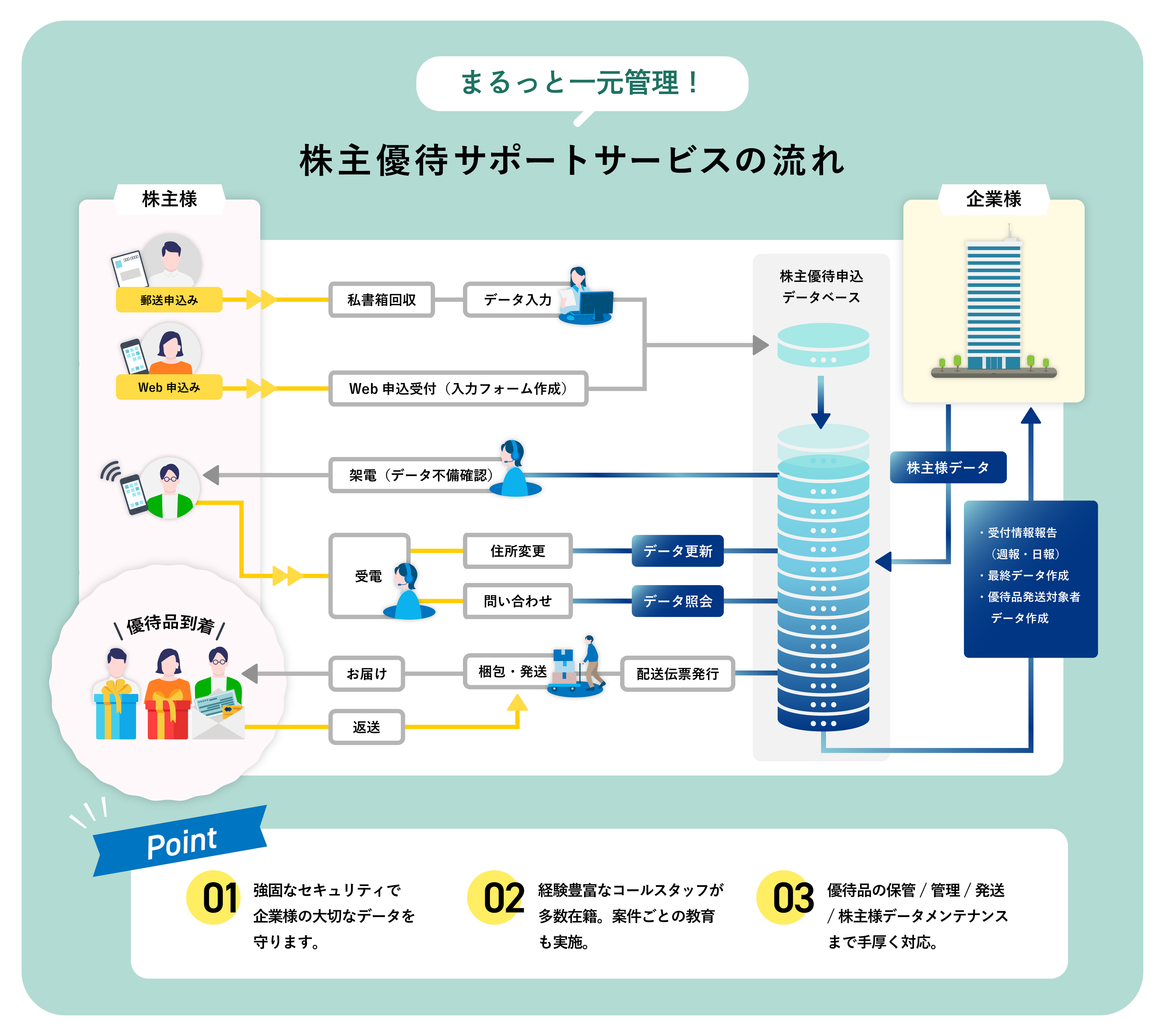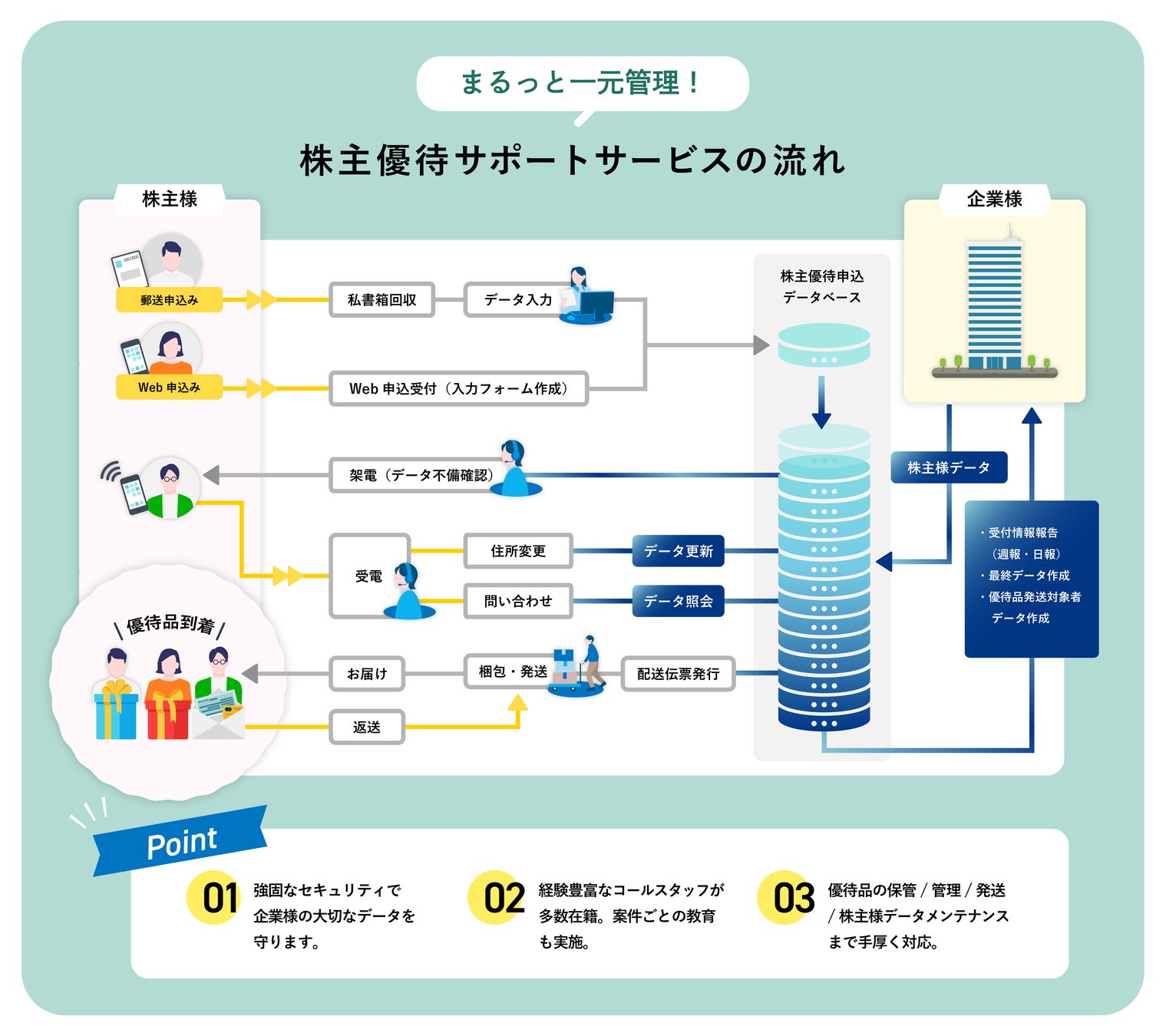 当社は、これまでの事務局代行業務の実績を基に、株主優待制度を行う企業様のサポートについても10年以上継続して行わせていただいております。総務部門の方々の株主優待制度への取り組みに向け、より一層、品質・満足度の高いサポートを行えるよう、今後も対応範囲の拡張について随時検討していきます。