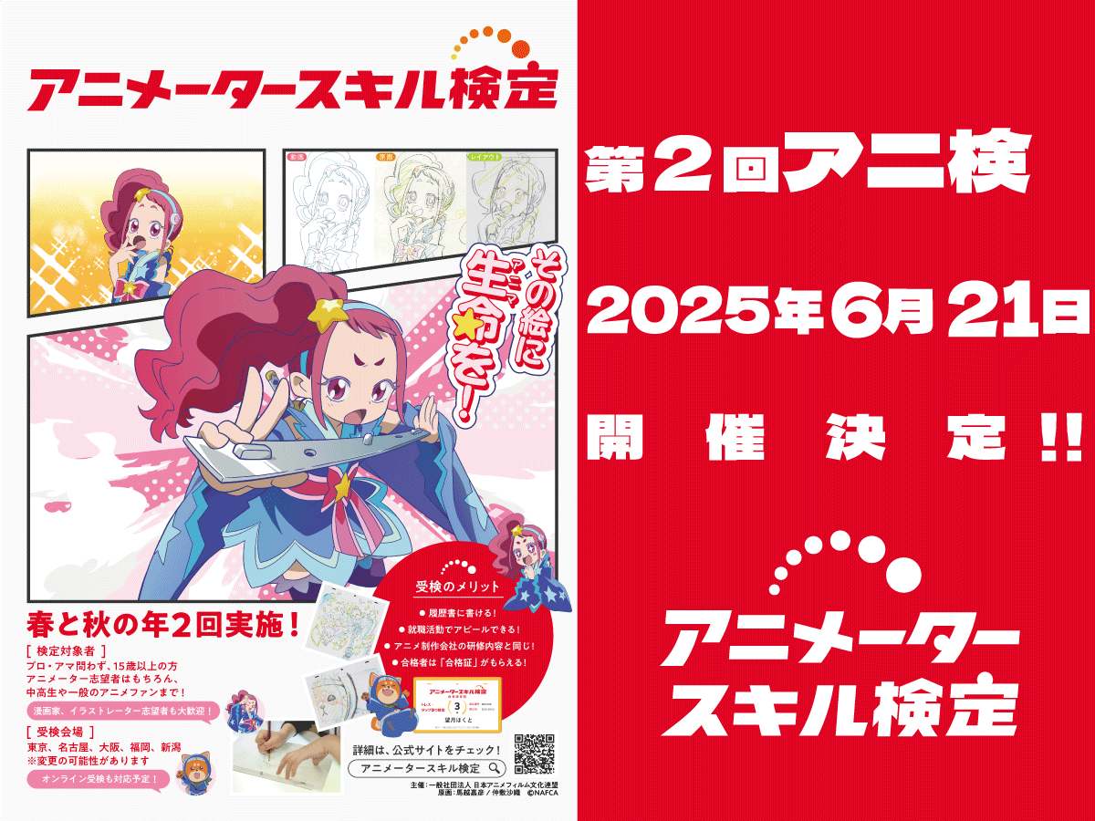 一般社団法人 日本アニメフィルム文化連盟(以下「NAFCA」)は、東京、大阪、名古屋、福岡、新潟の全国5都市で2025年6月21日(土)に第2回アニメータースキル検定(アニ検)の開催を決定いたしました。