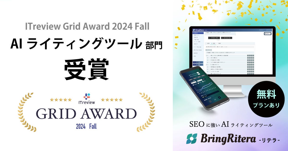株式会社BringFlower(東京都新宿区、代表取締役:稲田 高洋)が開発・運営する、SEOに強いAIライティングツール「BringRitera(リテラ)」が、IT製品レビュープラットフォーム「ITreview」で発表された「ITreview Grid Award 2024 Fall」の「AIライティングツール」部門で受賞したことをお知らせします。
