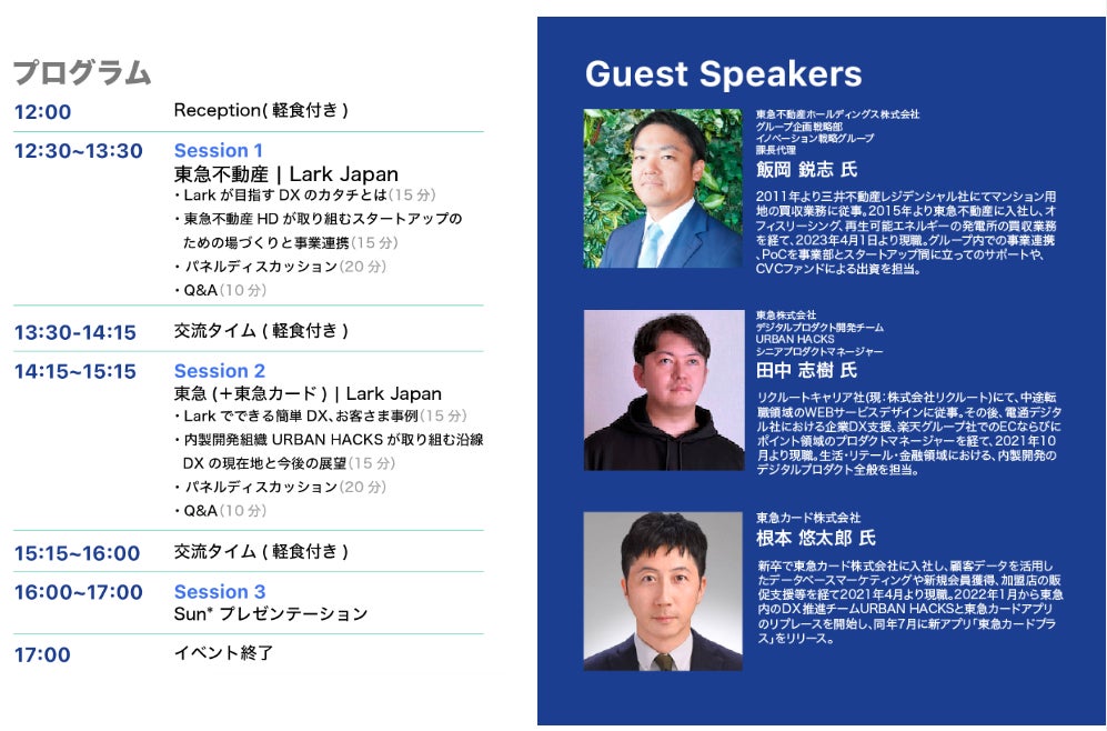 オープニングセッションでは、東急不動産様とLark Japanにて、渋谷を起点としたイノベーションやDXを通じたビジネス変革の必要性についてディスカッションを行い、2ndセッションではLarkのお客様である東急株式会社様とLark Japanにて商業施設、ホテルなどでのDX事例などを交えつつ、パネルディスカッションを実施する予定です。 3rdセッションでは、注目のスタートアップSun*様よりこれからのイノベーションをテーマにセッションを行っていただきます。