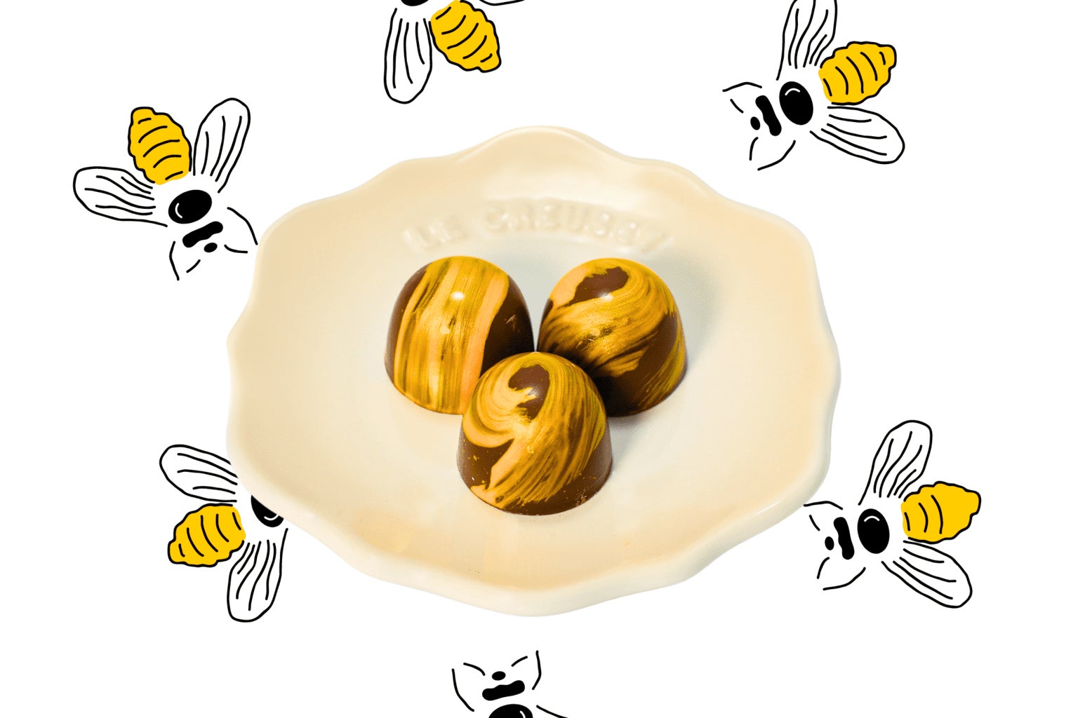 ハニーは甘くて粘性のある製品です。ハニーの味は、ハチが収集したネクターのタイプによって異なります。それは甘くて花のような味がするか、より強烈で苦い味がすることもあります。ハニーの色合いから、ネクターが収集された花のノートを見つけることもできます。ハチミツとミルクチョコレートのガナッシュは、心地よい甘さと忘れられない香りが魅力的です。この味からは、快適さと暖かさのハーモニーをお届けできると思います。