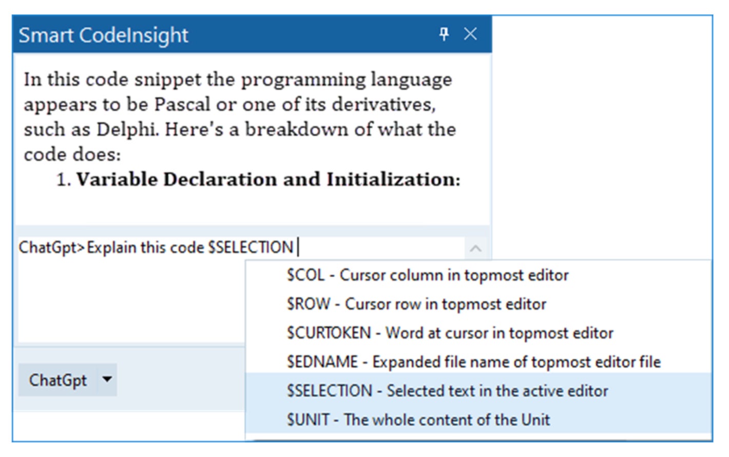 RAD Studio 12.2 では、ChatGPT、Gemini、Claude、およびローカル環境で実行可能なOllamaを用いたAIコード支援機能を搭載しました。12.3では、チャット・ウィンドウがMarkdown形式をサポートし、フォーマット化された読みやすい出力が可能です。また、Smart CodeInsightの設定ダイアログには、利用可能なAIモデルのリストが表示されるほか、AIに基づく新しい「ユニットの検索 / ヘッダーの検索」コマンドが追加されました。
