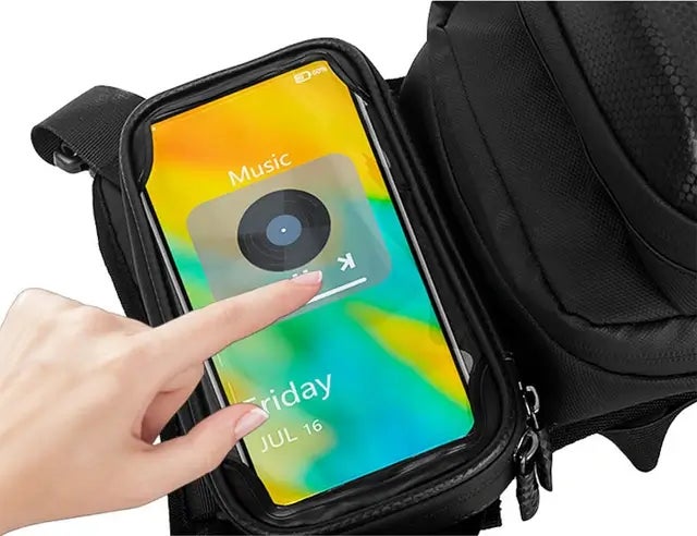 メインコンパートメントはダブルポケットで、よく使うアイテムと貴重品を分けるなど、合理的に使い分けが可能。また、スマートフォンをタッチ操作できる専用防水ケースを備えているので、毎回スマホを取り出す必要がなく、そのまま操作可能です。