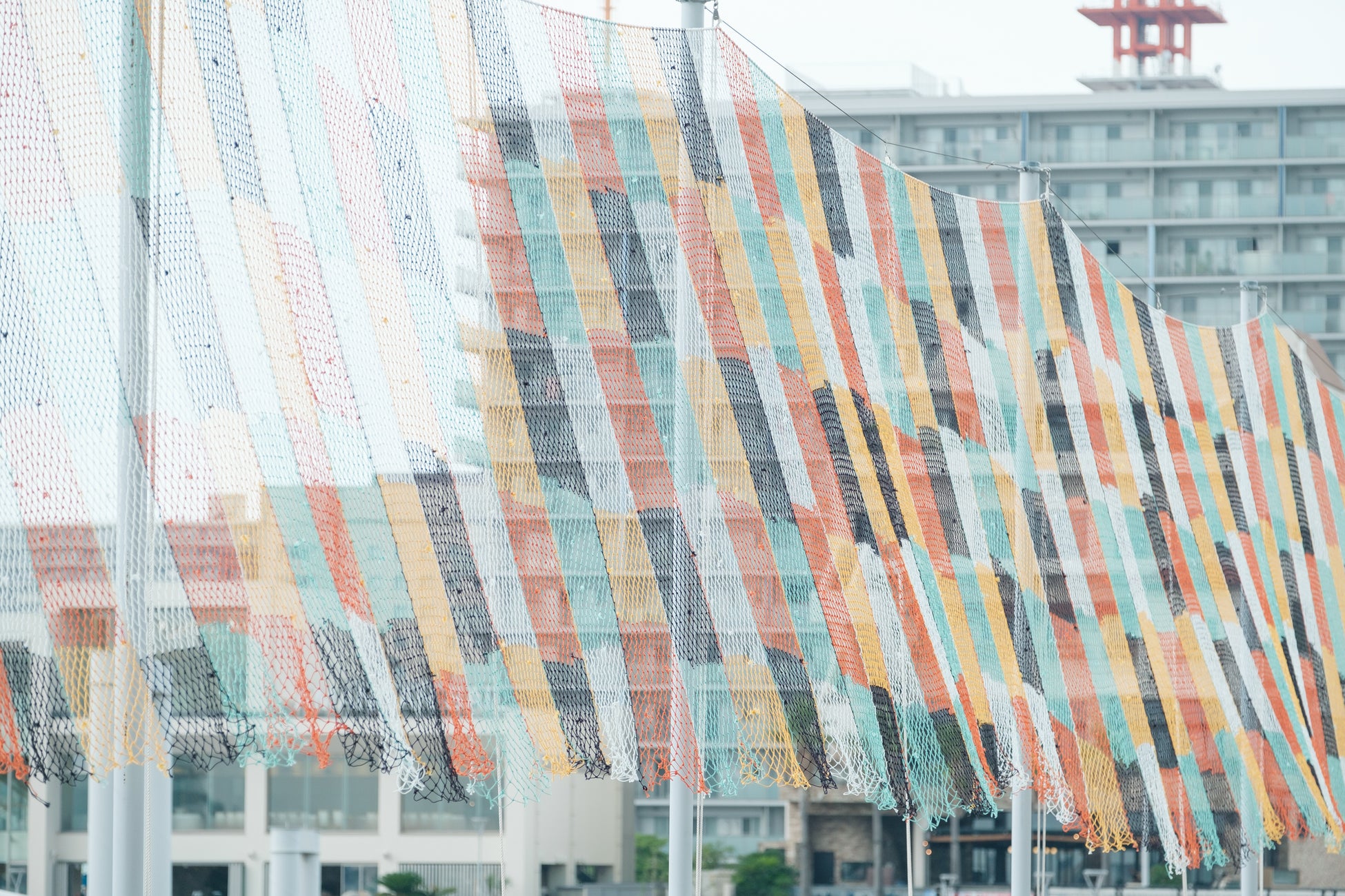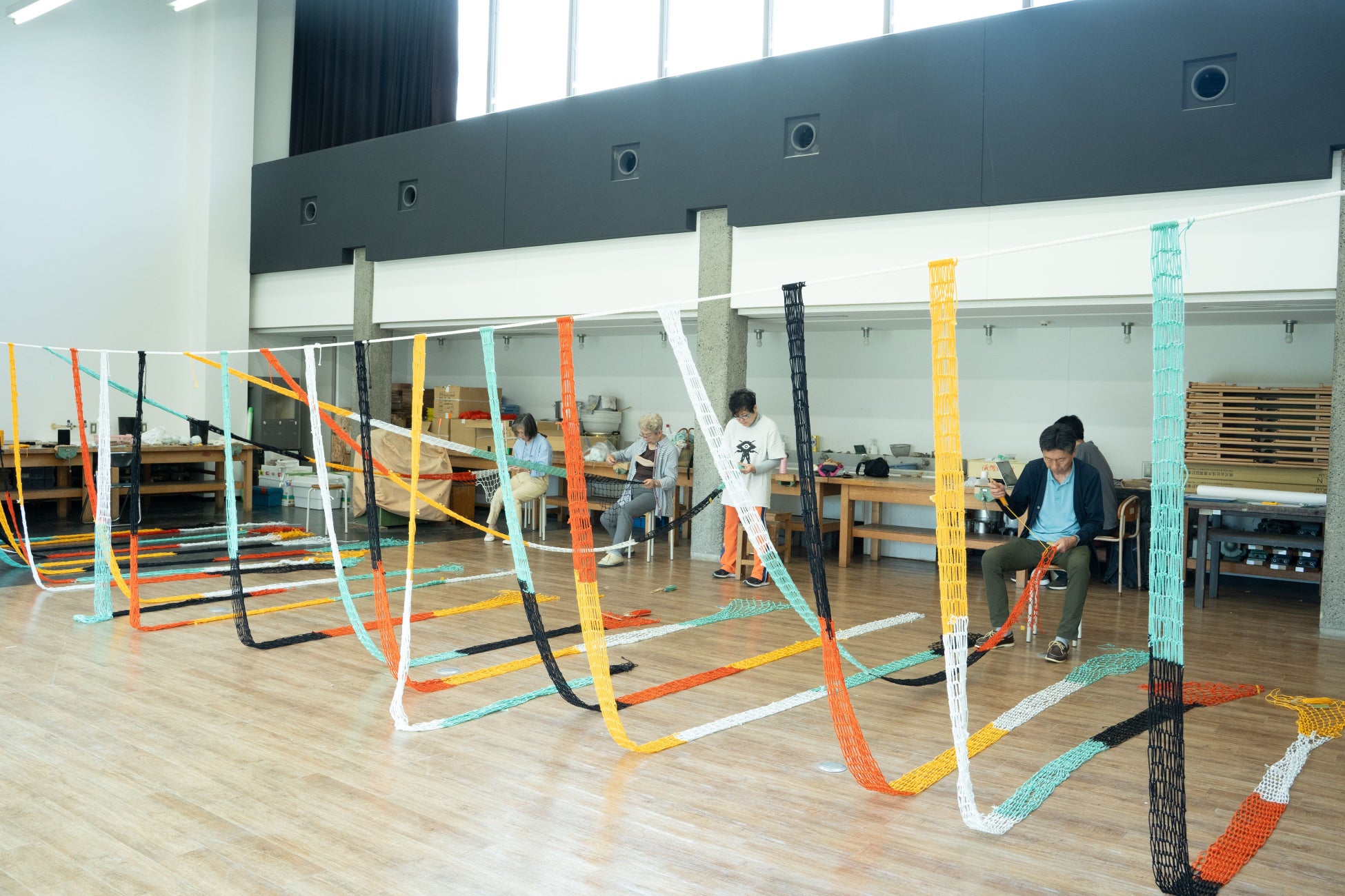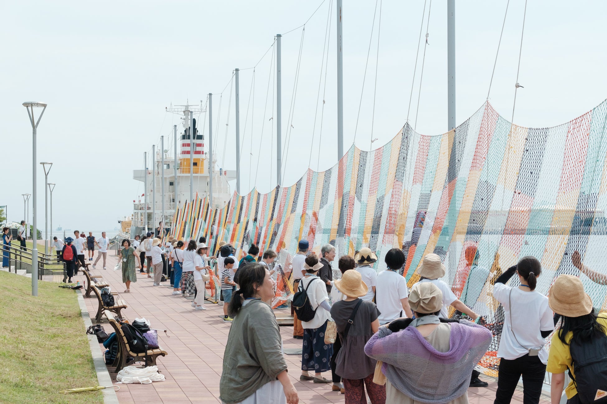 ②幅60mを超えるさんばしひろばの《そらあみ》を、海風クルーと共に編み上げました。会期中も編み続け、編んだ網はさんばしひろばに展示されます。