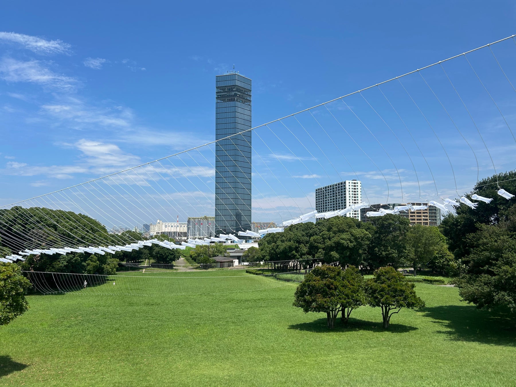 参加者と共に漁網を編み、空に掲げることで、風景を捉え直す。ボランティアサポーターの「海風クルー」と共に編み上げました。工場地帯を背景とする、千葉みなとならではの海の風景を現出します。