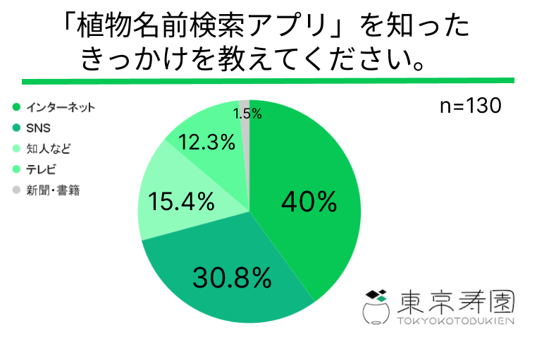 「植物名前検索アプリ、を知ったきっかけを教えてください。」という質問に、「インターネット」と回答した方は40%、「SNS」と回答した方は30.8%、「知人など」と回答した方は15.4%、「テレビ」と回答した方は12.3%、「新聞・書籍」と回答した方は1.5%という結果になりました。
