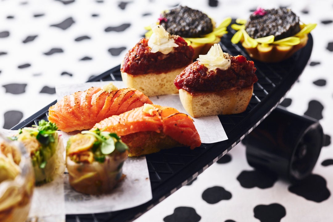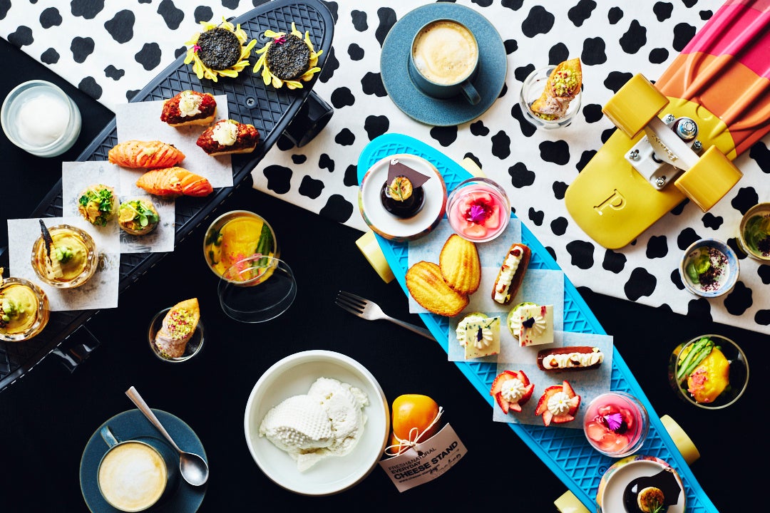 ホテルインディゴ東京渋谷11階に位置するGallery 11では、ホテルのネイバーフッドスターである「SHIBUYA CHEESE STAND」から仕入れる、新鮮なチーズを使用した【チーズアフタヌーンティー】を渋谷のストリートカルチャーを感じるスケートボードに載せて提供します。