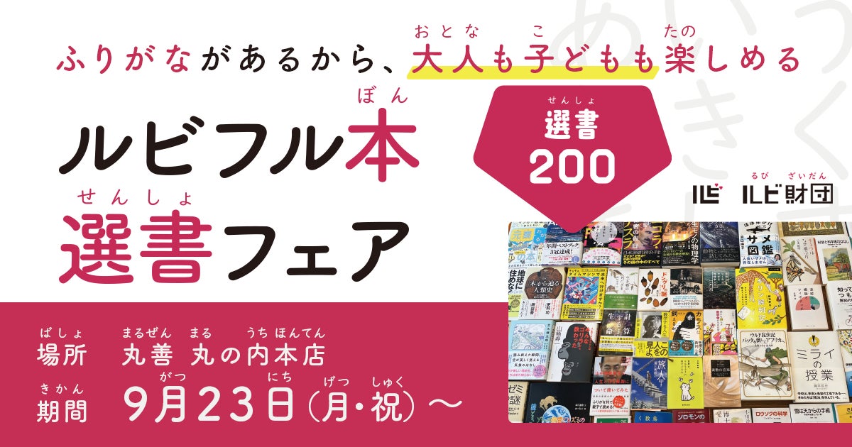 社会にふりがな(ルビ)を適切に増やすことで、あらゆる人が学びやすく、多文化が共生する「ルビフル」な社会づくりを目指す一般財団法人 ルビ財団(所在地:東京都港区、代表理事:伊藤 豊、以下ルビ財団)は、丸の内オアゾの丸善 丸の内本店にて、9/23より、ふりがながあるから大人も子供もたのしめる「ルビフル本」の選書フェアが開催されることをお知らせします。