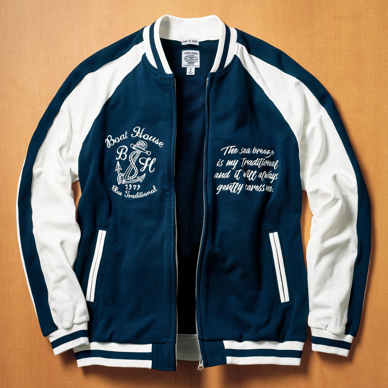 アイビースタイルの定番として愛されてきたスタジアムジャンパー。そのスポーティなデザインはそのままに、裏毛のスウェット地で仕立てた一着です。ソフトでリラックス感のある着心地が魅力。〈ボートハウス〉のアイデンティティであるクレストマークとメッセージのレタリングがアクセントになった、マリンテイストあふれるデザインが秀逸です。