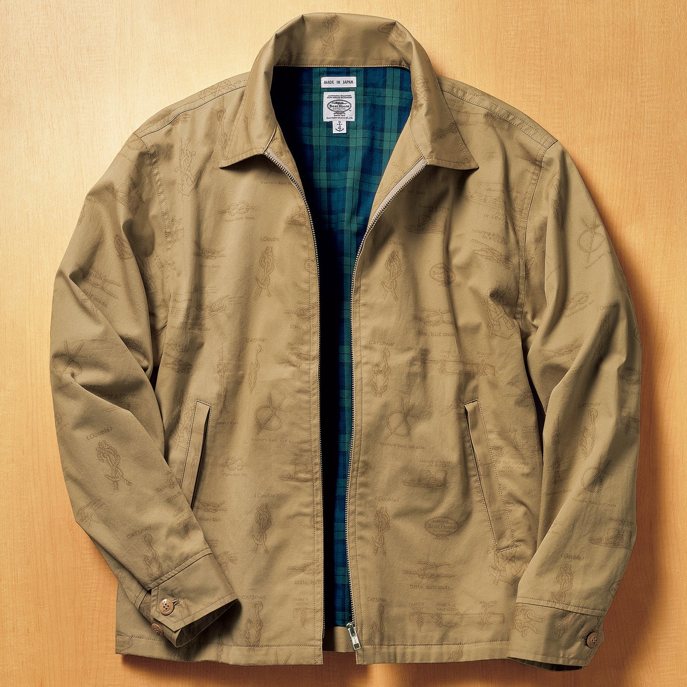 船舶の運用に欠かせないロープノット(ロープの結び方)をモチーフにした絵柄をちりばめたスウィングトップです。同系色の総柄なので無地感覚で着こなせ、さりげない大人のお洒落を演出。アイビーを彷彿させるブラックウォッチの裏地付きで、長い期間着用できます。