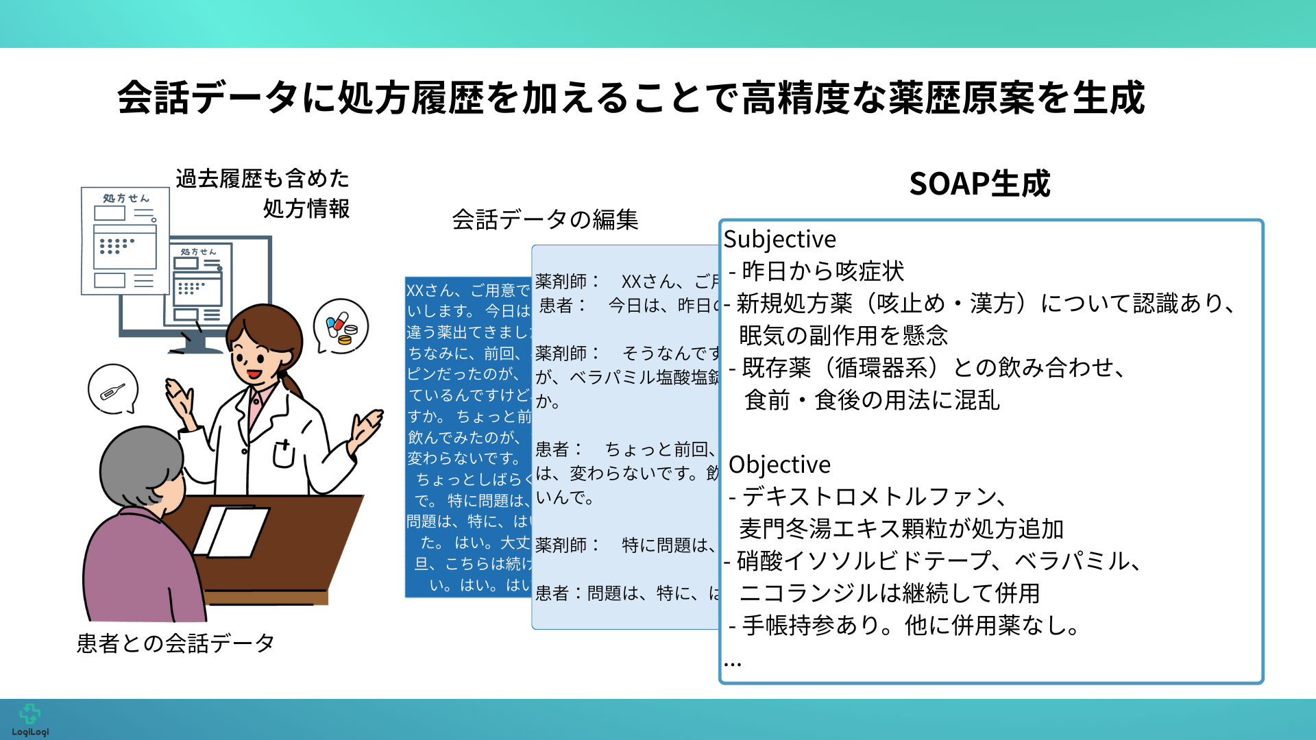 本技術では「前回から薬がどう変わったか(追加・削除・変更)」という時系列の変化をAIに与えます。例えば「ベニジピンからベラパミルへの変更」といった具体的な変遷をAIが理解することで、服薬指導での変更理由や副作用の確認の背景を踏まえた上で、間違いのない薬歴(SOAP)生成を支援します。