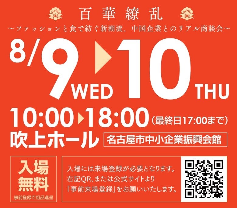 【後援(公的機関)】日本貿易振興機構(ジェトロ)名古屋貿易情報センター・中華人民共和国駐名古屋総領事館・愛知県・三重県・名古屋商工会議所・(一社)東海日中貿易センター・ナゴヤファッション協会