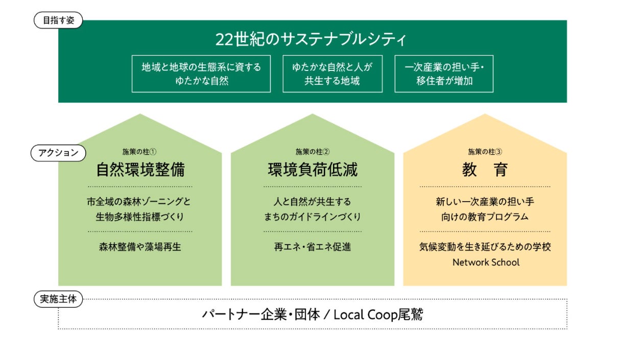 本コンソーシアムは、「地域と地球の生態系に資するゆたかな自然」、「ゆたかな自然と人が共生する地域」及び「一次産業の担い手と移住者の増加」を軸とした尾鷲市ゼロカーボンシティ宣言並びにネイチャーポジティブ宣言における22世紀のサステナブルシティを目指し、設立いたしました。今後は【自然環境整備】【環境負荷低減】【教育】の3つの柱を軸に活動してまいります。