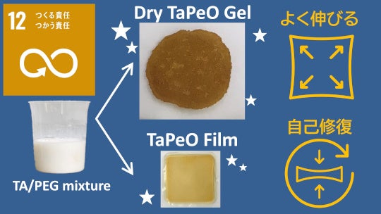 熊本大学大学院先導機構/大学院生命科学研究部 (薬学系) の東 大志准教授、同大学大学院薬学教育部博士前期課程2年の後藤唯花大学院生(当時)らのグループは、タンニン酸 (TA) と超高分子量のポリエチレングリコール (PEO) を水中で混合すると、ゴム状によく伸びるゲル (TaPeO ゲル) が得られることを明らかにしました。TaPeO ゲルを水分を含んだ状態で引っ張るとよく伸び、最大 1,000% の伸長率を示しました。また、TaPeO ゲルを乾燥させると、軽量で強靭なプラスチック様の素材に変化しました。大変ユニークなことに、乾燥 TaPeO ゲルを破断しても、破断面をお湯に浸し再接着させると、元通りになりました。また、乾燥 TaPeO ゲル自体は固い素材ですが、お湯に浸して応力を加えると変形可能でした。変形した素材を再度お湯に浸すと、最初の形に戻ったことから、乾燥 TaPeO ゲルは形状記憶能を有することが分かりました。さらに、TaPeO ゲルを調製する際に生じる不要な上清を捨てずに乾燥すると、伸長率1,500% 以上と、今回使用した試験機では測定できないほどよく伸びるフィルム (TaPeO フィルム) を調製することができました。すなわち、TA と PEO を用いると、“ごみゼロ”で強くて賢いゲルやフィルムを調製することができました。今後、本素材を医療素材などに応用していく予定です。