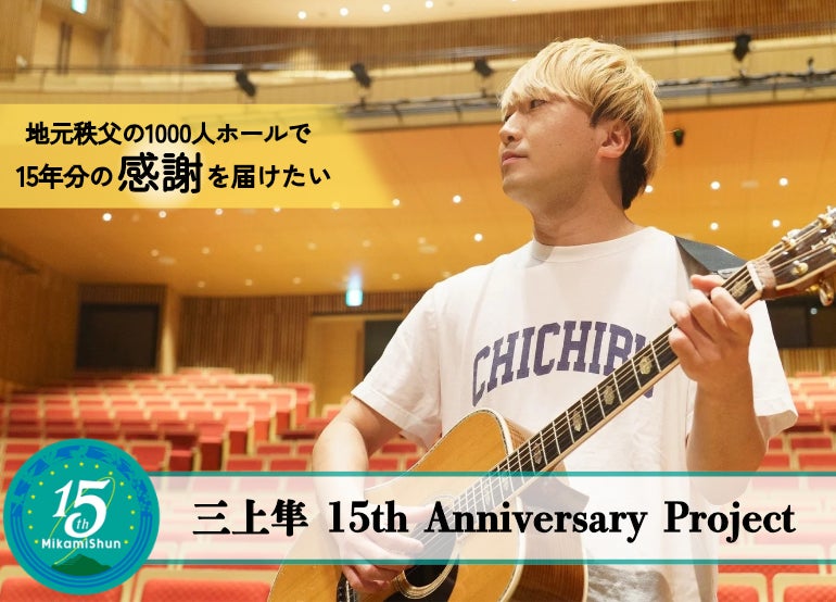 埼玉県秩父市出身のシンガーソングライター三上隼は、このたび、活動15周年の節目として、2026年 11月8日に秩父宮記念市民会館で開催する記念ホールワンマンライブに向け、クラウドファンディングプラットフォームのMotionGallery にて1月5日よりクラウドファンディングを開始しました。3月30日まで実施し、目標金額は150万円。集まった資金は、秩父テーマソング集CD やドキュメンタリー映像の制作費などに使用させていただきます。