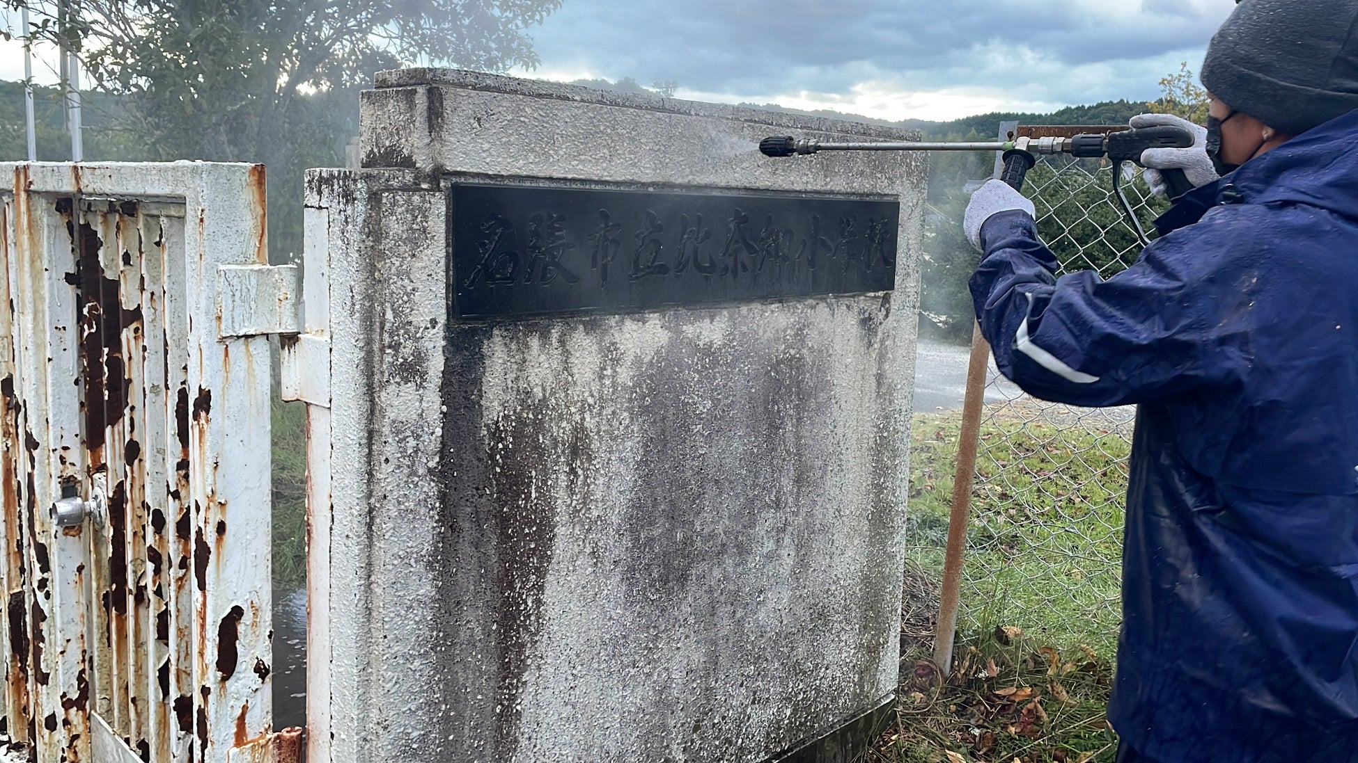 塗装をする前に古くなり汚れた校門の壁を高圧洗浄でキレイにします。