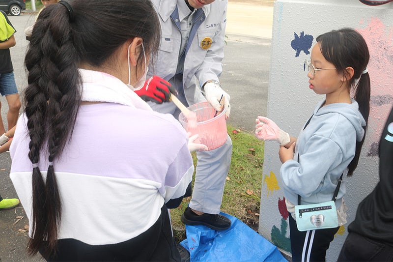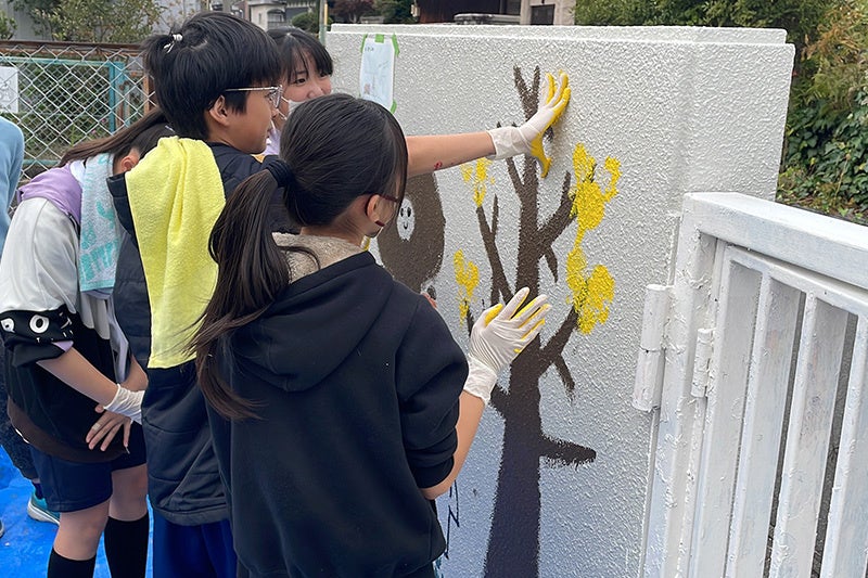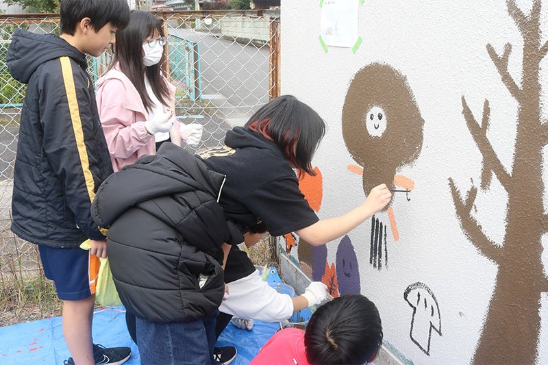 名張市立比奈知小学校の小学6年生38名が正門と裏門の壁に四季をテーマに彩る(日時: 2024年11月14日(木)8時30分~15時30分 場所: 三重県名張市下比奈知1422番地)