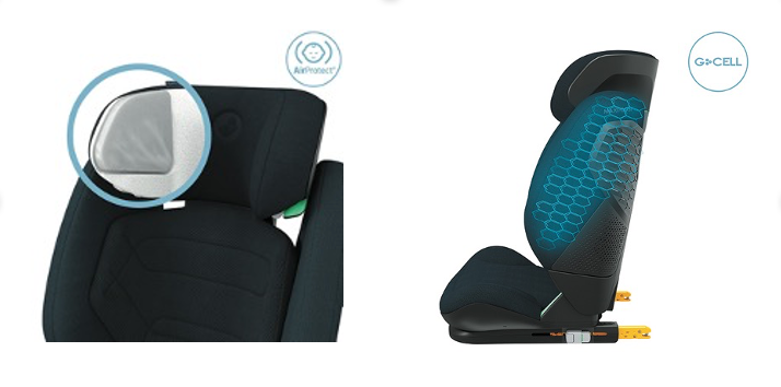 頭部外傷のリスクを最大20%軽減するマキシコシ独自の特許技術『AirProtect(エアプロテクト)』を搭載した大型ヘッドレストは、側面衝突に対して効果を発揮します。さらに、本体の両サイドにはハニカム構造でドア側からの衝撃を吸収する「G-CELL2.0」も搭載されています。