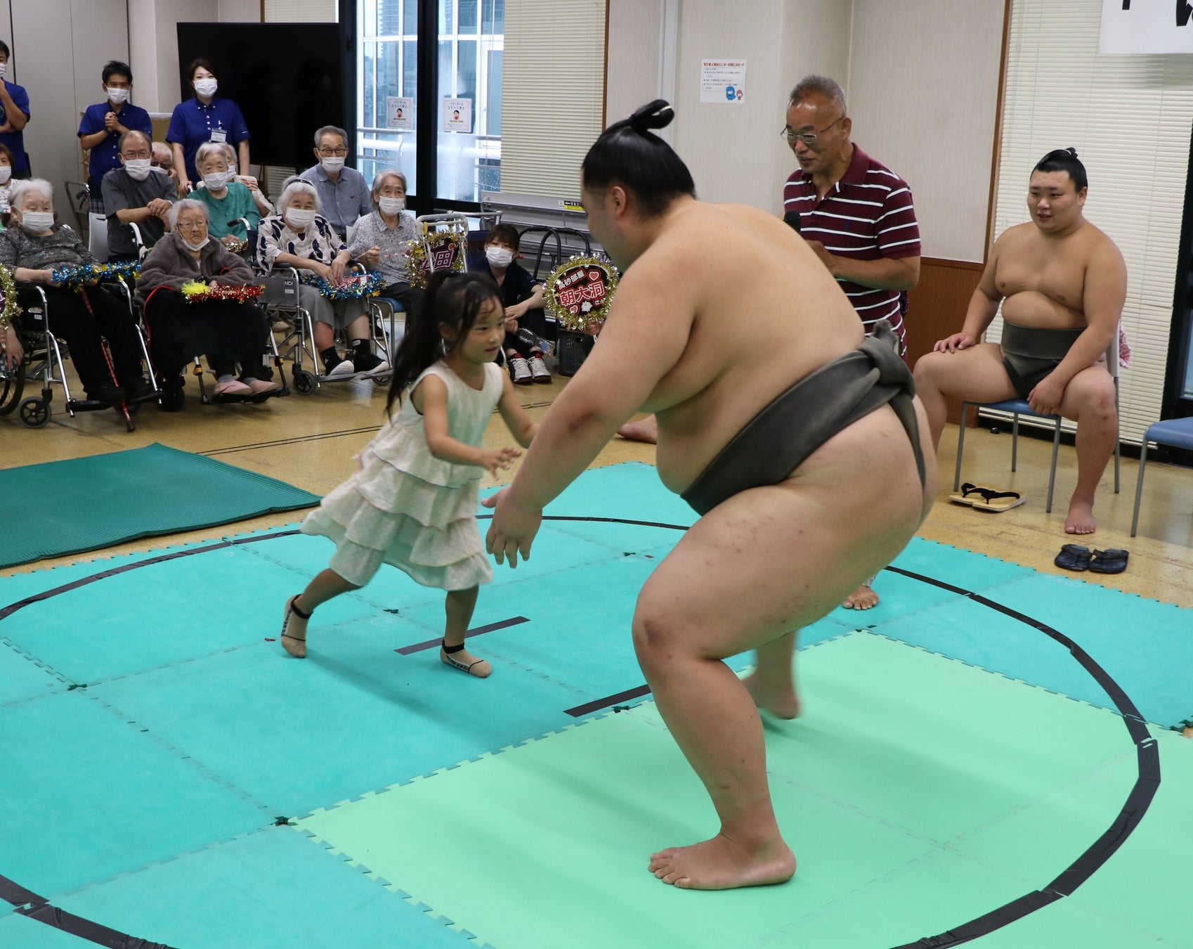 荒川老人福祉センター(荒川区荒川1—34—6)では、猛暑等により外出の自粛が続いている高齢者に社会参加の機会を設けフレイル予防を図ろうと、本日8月30日(金曜)、高砂部屋のお相撲さんを招いて、相撲イベントを開催しました。イベントでは、参加者からの願いをお相撲さんにひとつずつ叶えてもらいました。