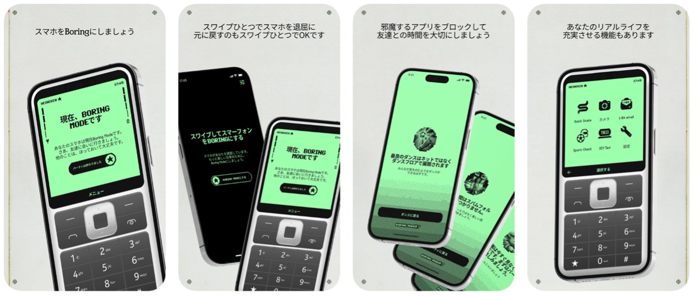 2024年4月にミラノデザインウィークで、ストリートカルチャーと現代ファッションを繋ぐブランドBODEGA(ボデガ)とのコラボレーションで、ダムフォン(いわゆるガラケーのこと)である「The Boring Phone(退屈な携帯)」を発表。今回、ハイネケンはアプリ版として、The Boring Mode(退屈モード)を単独で開発しました。このアプリはダウンロードの際はもちろん、ダウンロード後も課金要素の一切ない完全無料アプリです。