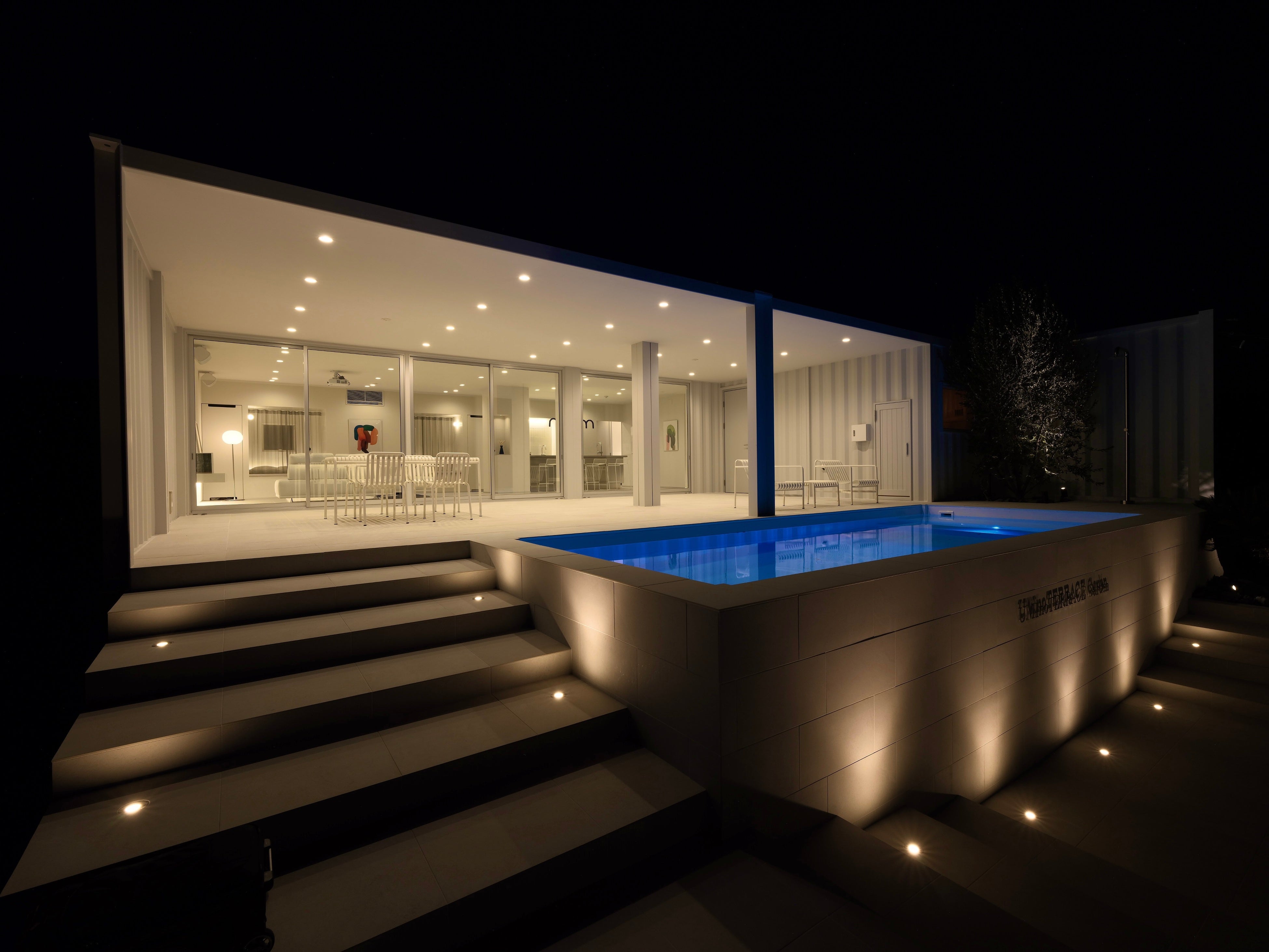 UMInoTERRACE Gardenは、千葉県南房総市に位置する一棟貸しプライベートヴィラです。太平洋を一望する全天候型テラスに、通年利用可能な7m温水プール(水温30〜34℃)と8名同時利用可能な本格ひのきサウナを完備。最大14名が宿泊可能な広大な空間に、8ftビリヤード・カラオケDAM・BOSEホームシアターを備えた「大人のプライベートリゾート」です。
