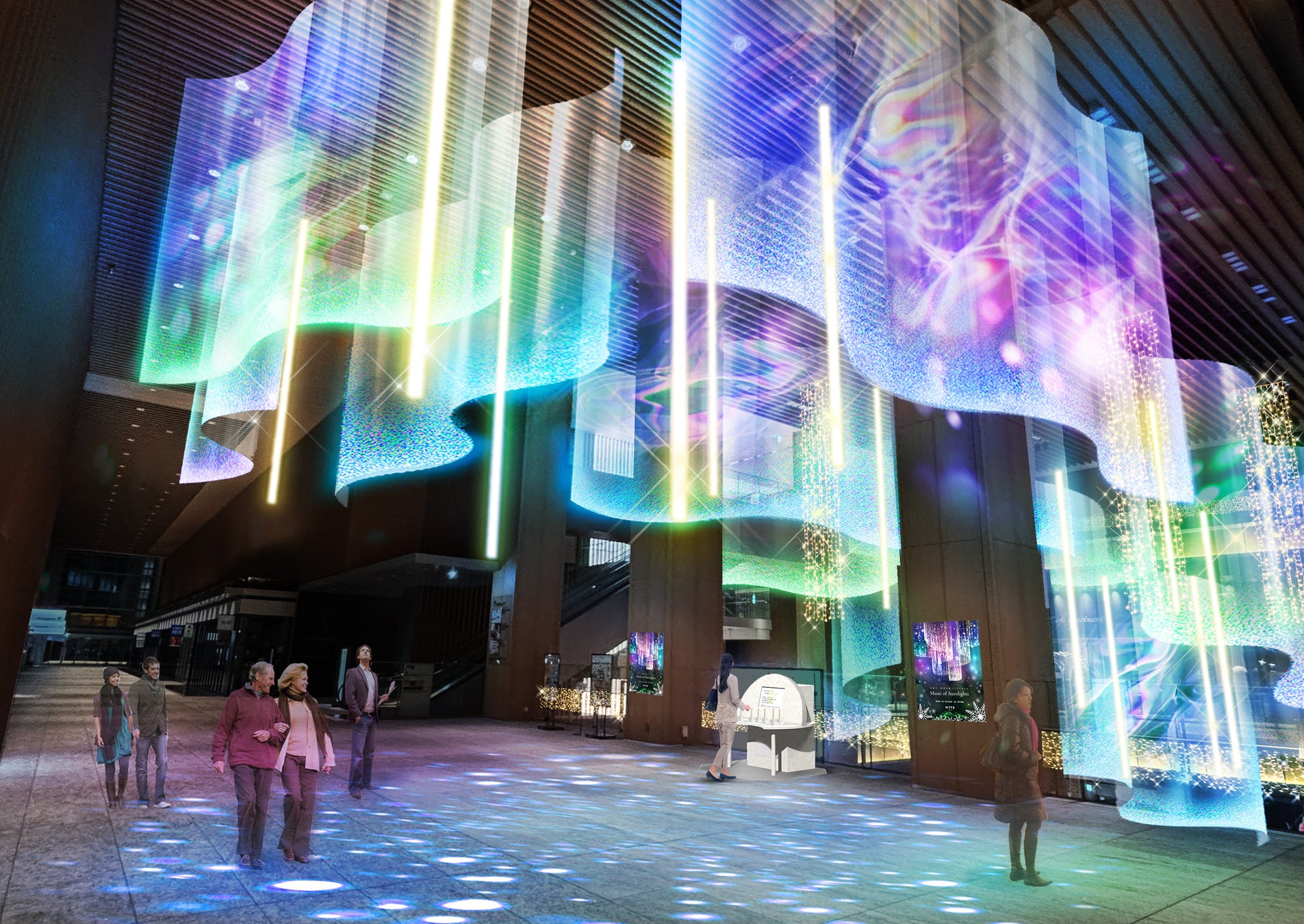 また、2階貫通通路に設置された13音階のハンドベルで自由に奏でた音楽を、AIシステムが分析し「あなただけのカラー」となって空間全体に広がるインスタレーションをお楽しみいただくことができます。