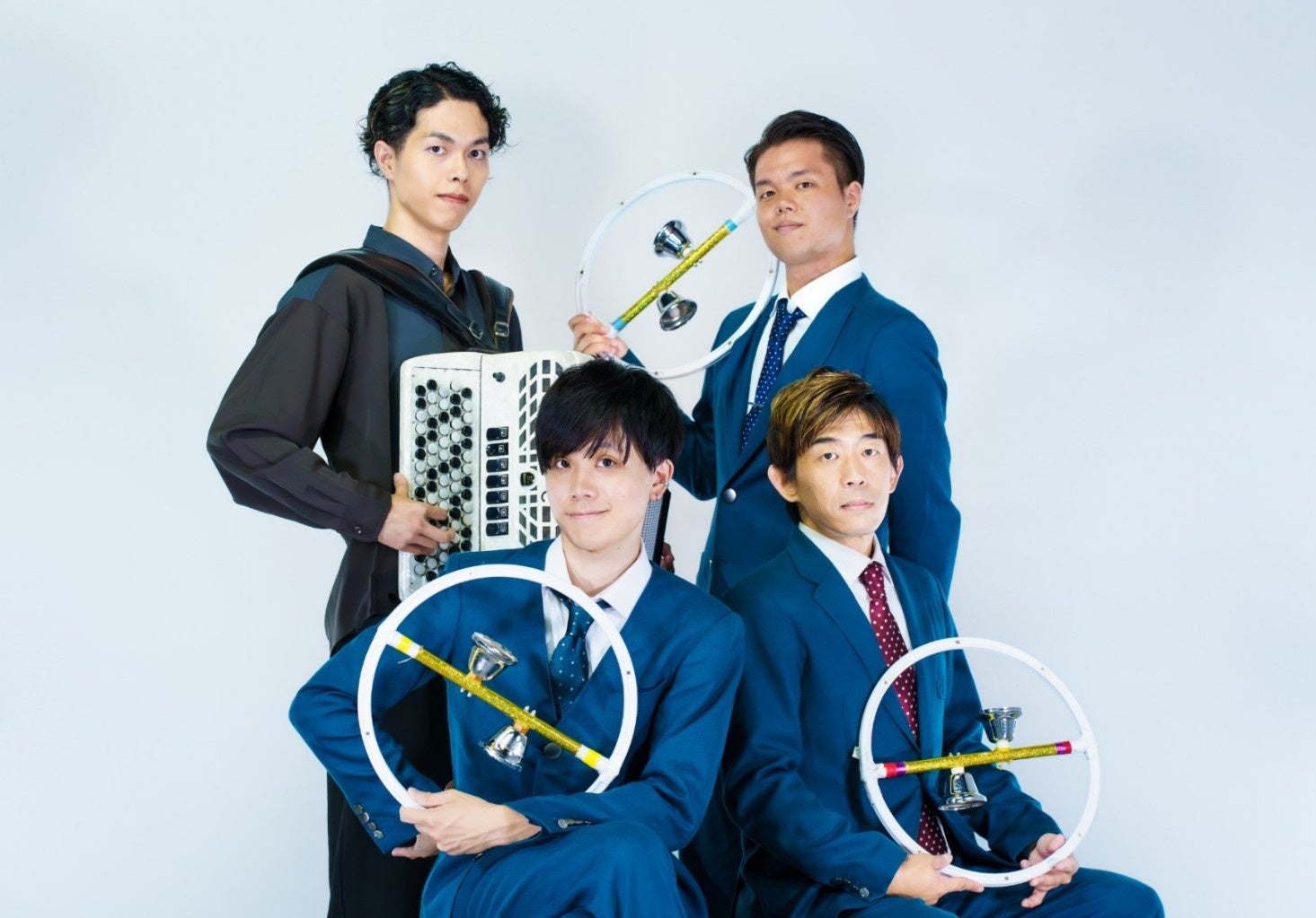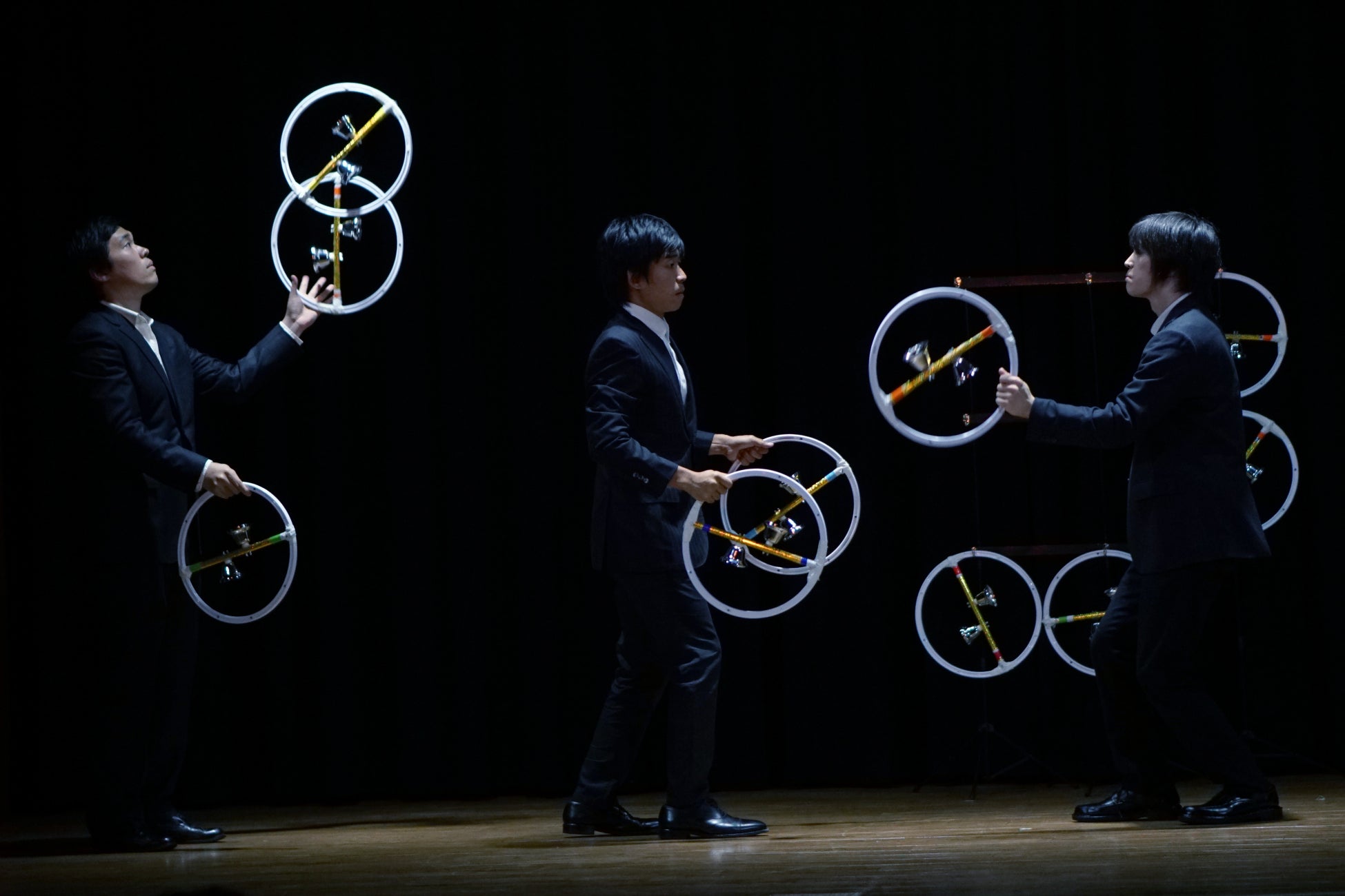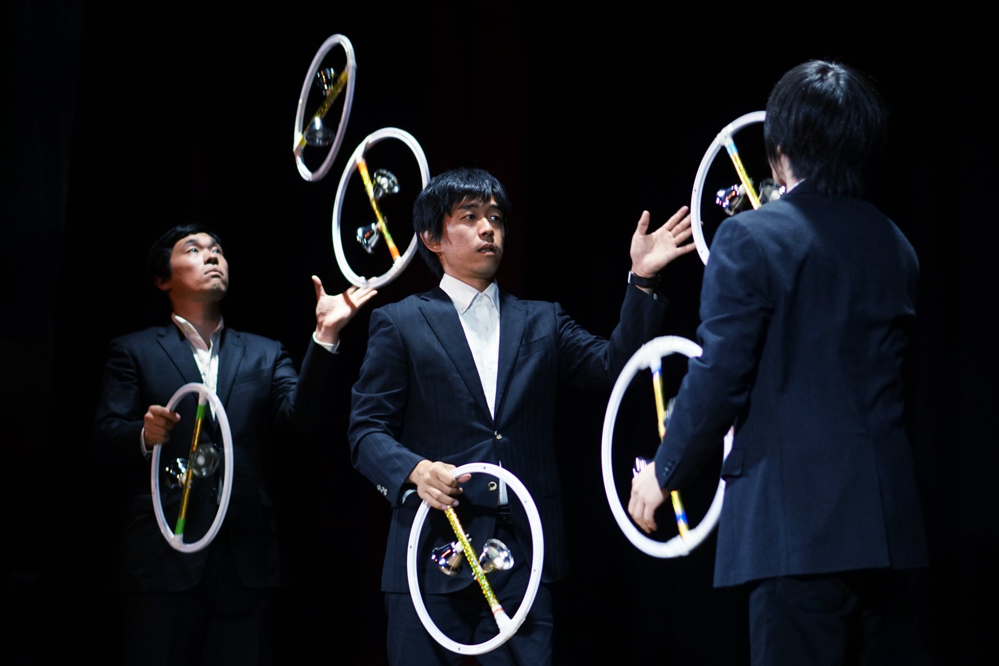 ジャグリングと音楽が融合したパフォーマンスを披露する「空転軌道」。ハンドベルジャグリングをはじめ、さまざまな道具が登場します。目と耳で楽しむ、お洒落でお茶目なパフォーマンスをお楽しみください。