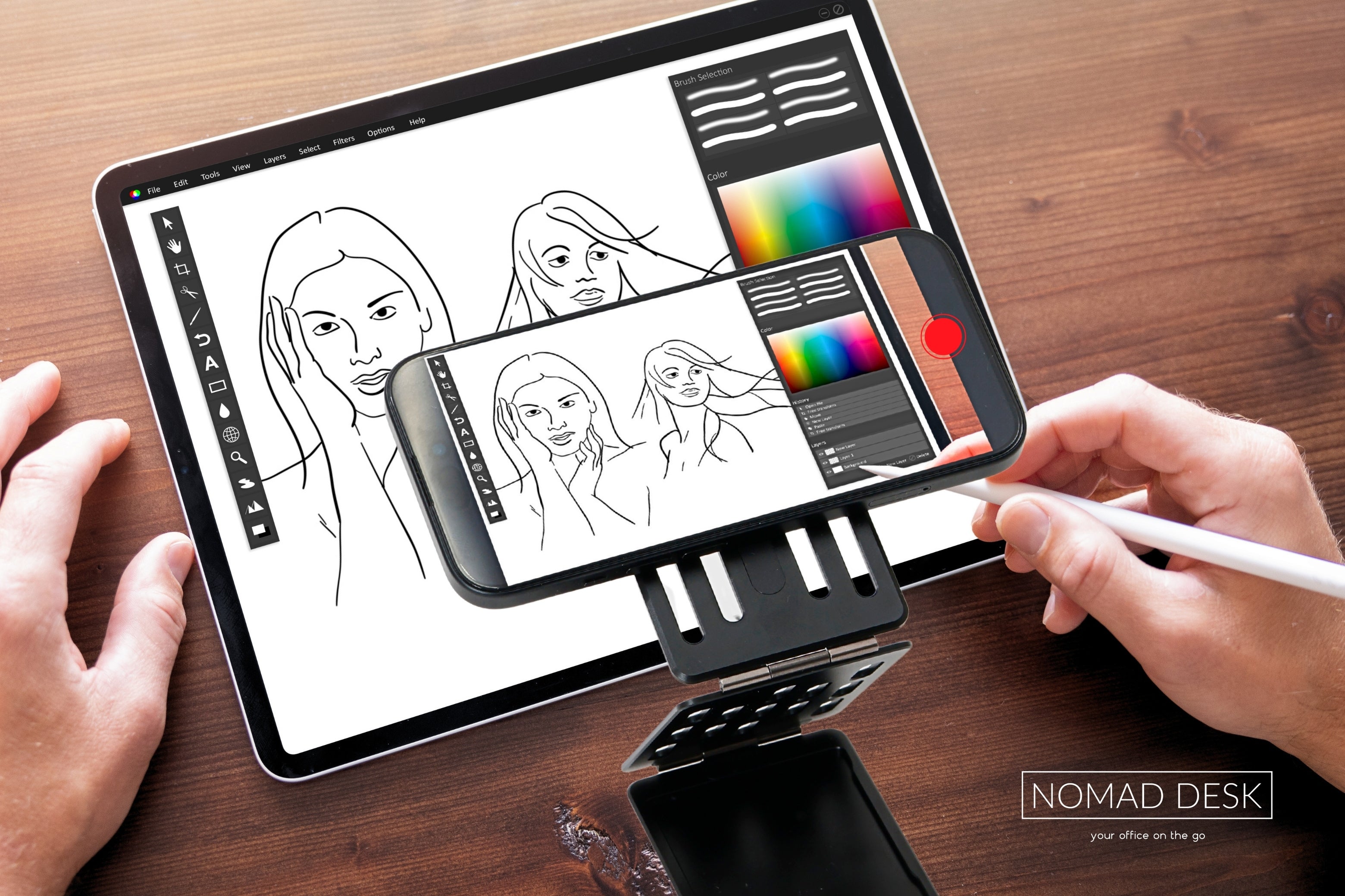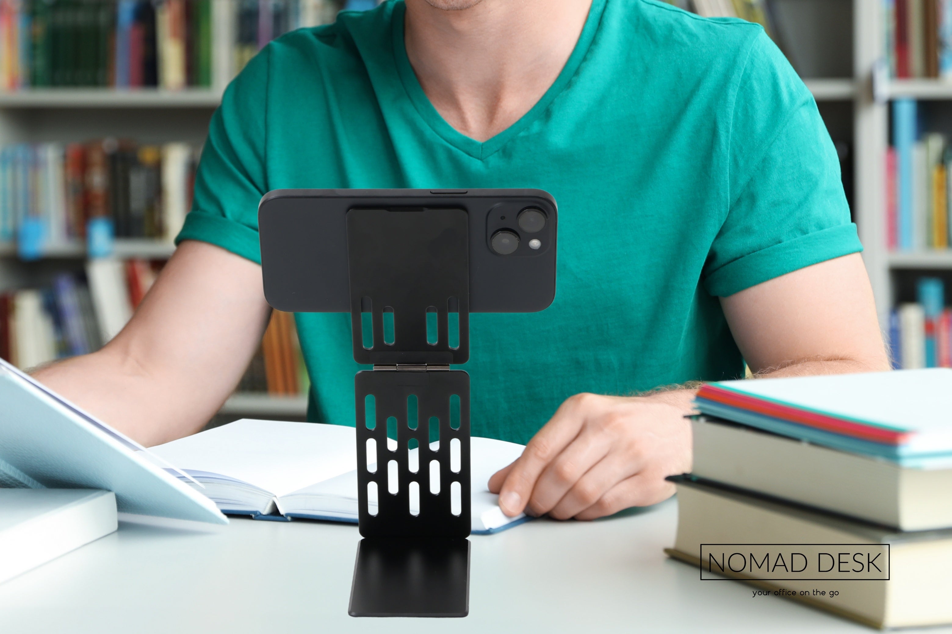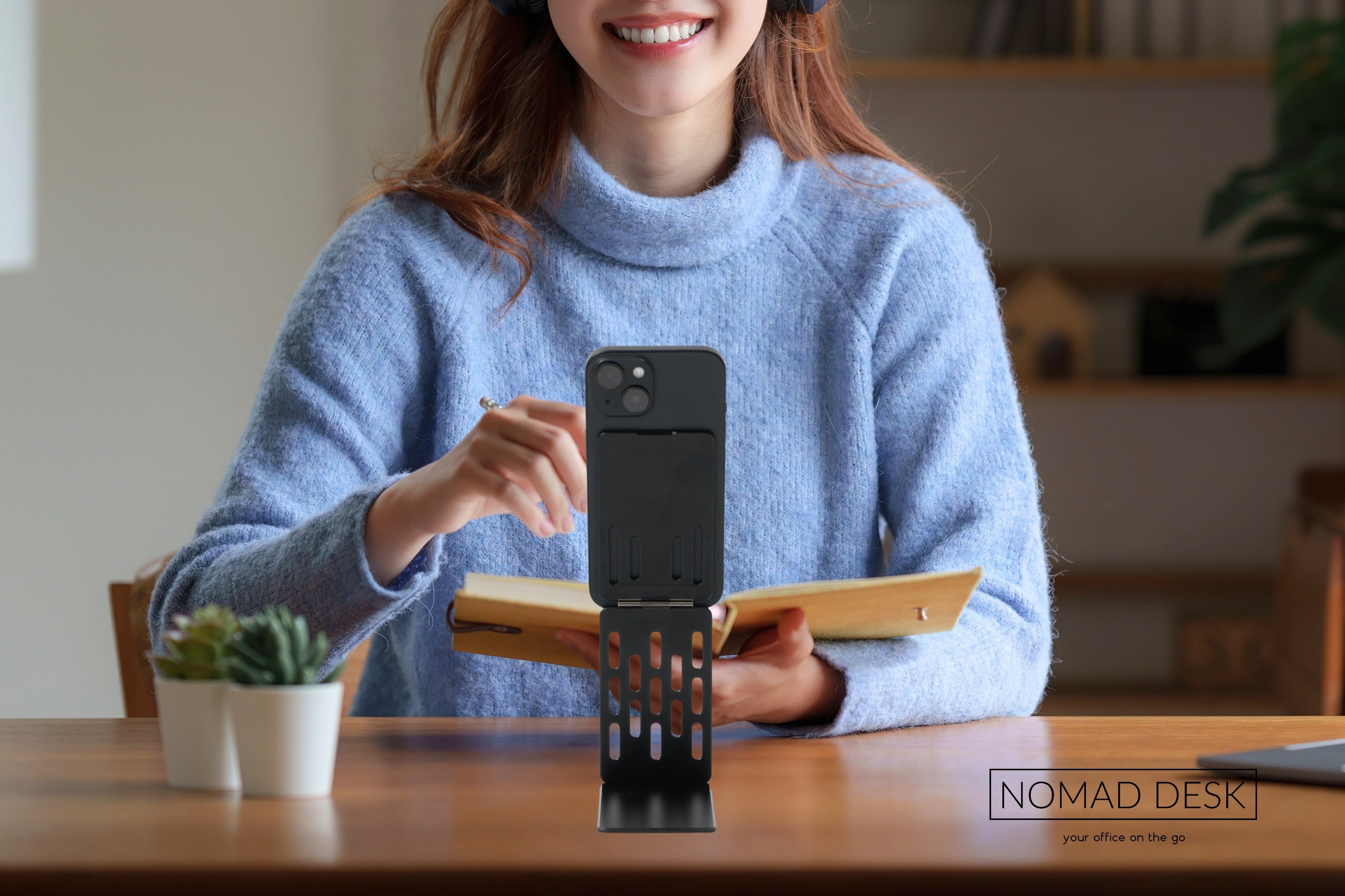 耐久性に優れたアルミニウム製のボディを採用。3つ折りを広げることで卓上スタンドとして最大約24cmの高さまで実現(無印iPhone縦置きの場合)、自然な目線の高さと正しい姿勢を確保します。長時間のデスクワークや会議における身体への負担軽減にも貢献します。