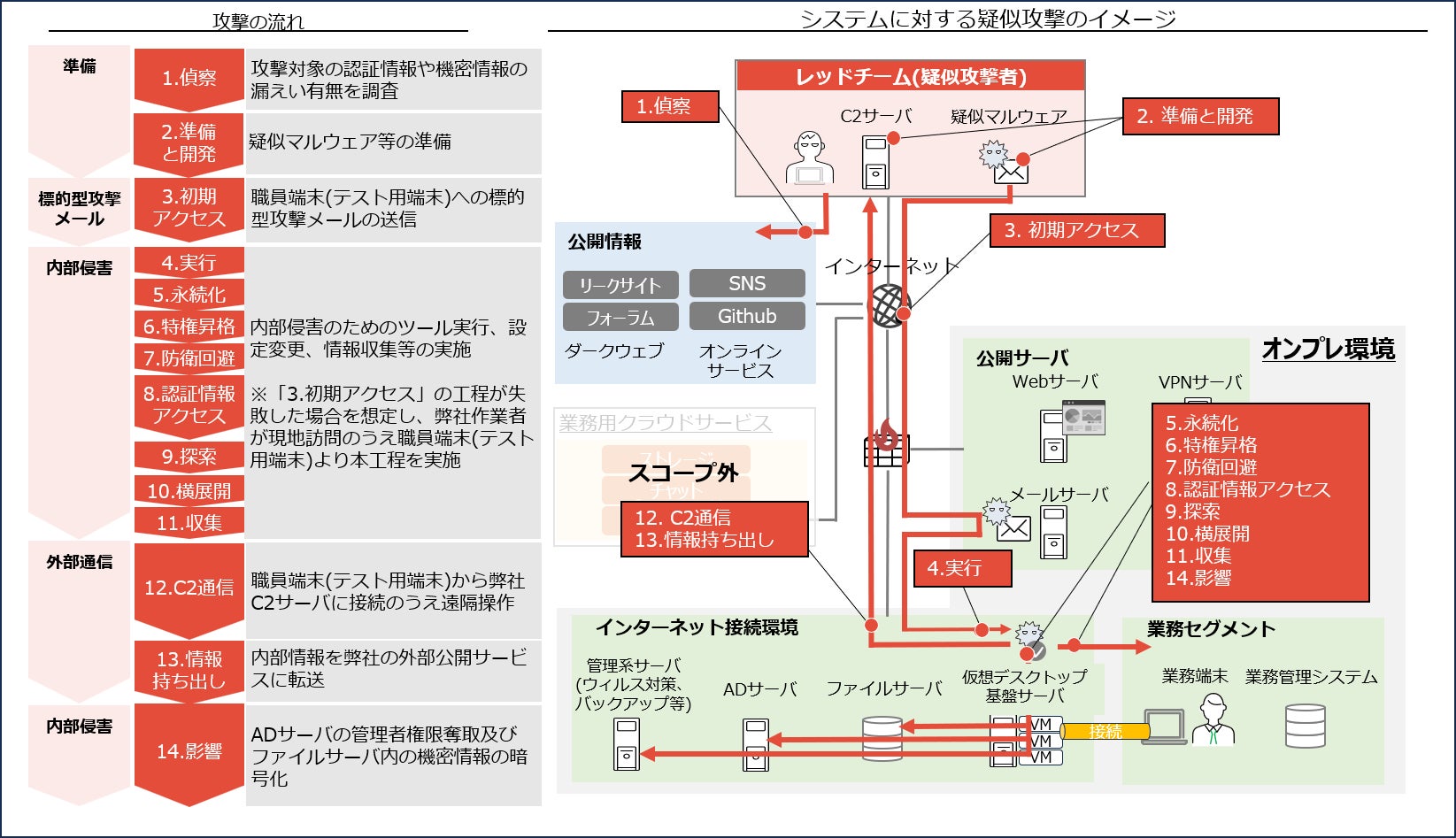 これら実績や経験を活かして、本サービスにおける調査だけでなく、攻撃者目線でシナリオ作成をおこなえることが当社の強みです。