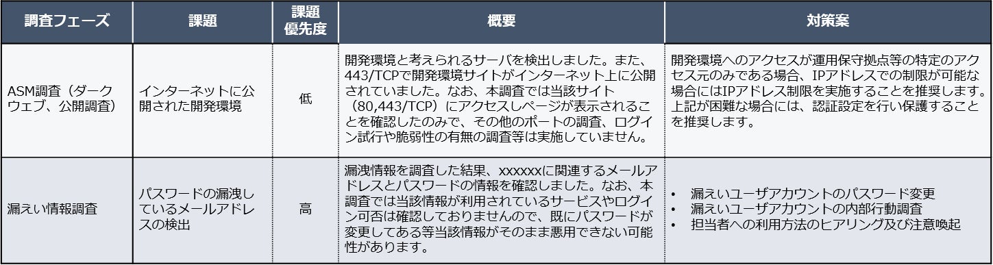 STEP1で得られた調査結果は、攻撃者視点を踏まえて課題、優先度、概要、対策案といった形で整理されていますので、自組織に置き換えて対策を検討する際にご活用いただけます。