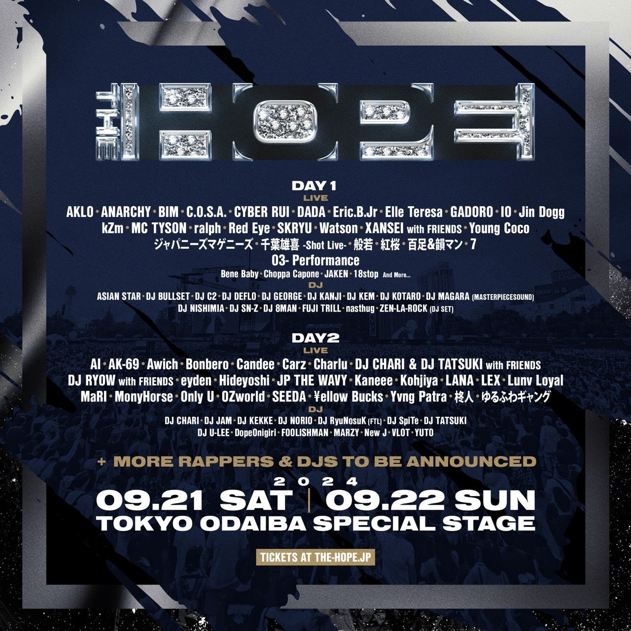 勢い溢れるホープからシーンを牽引するレジェンドまで、世代を超えてHIP HOPシーンの最前線で活躍するアーティストが集結する「THE HOPE」。昨年度は、お台場の特設屋外ステージを舞台に国内HIP HOPイベント最大動員記録である3万人の観客を沸かせ、日本のHIP HOPの歴史に名を刻んだ。3年目となる今年も、東京お台場にて9月21日(土)、9月22日(日)と初の二日間での開催が決定。先日の第一弾アーティスト&DJ発表に続き、本日第二弾出演アーティスト&DJと出演スケジュールが解禁となった。