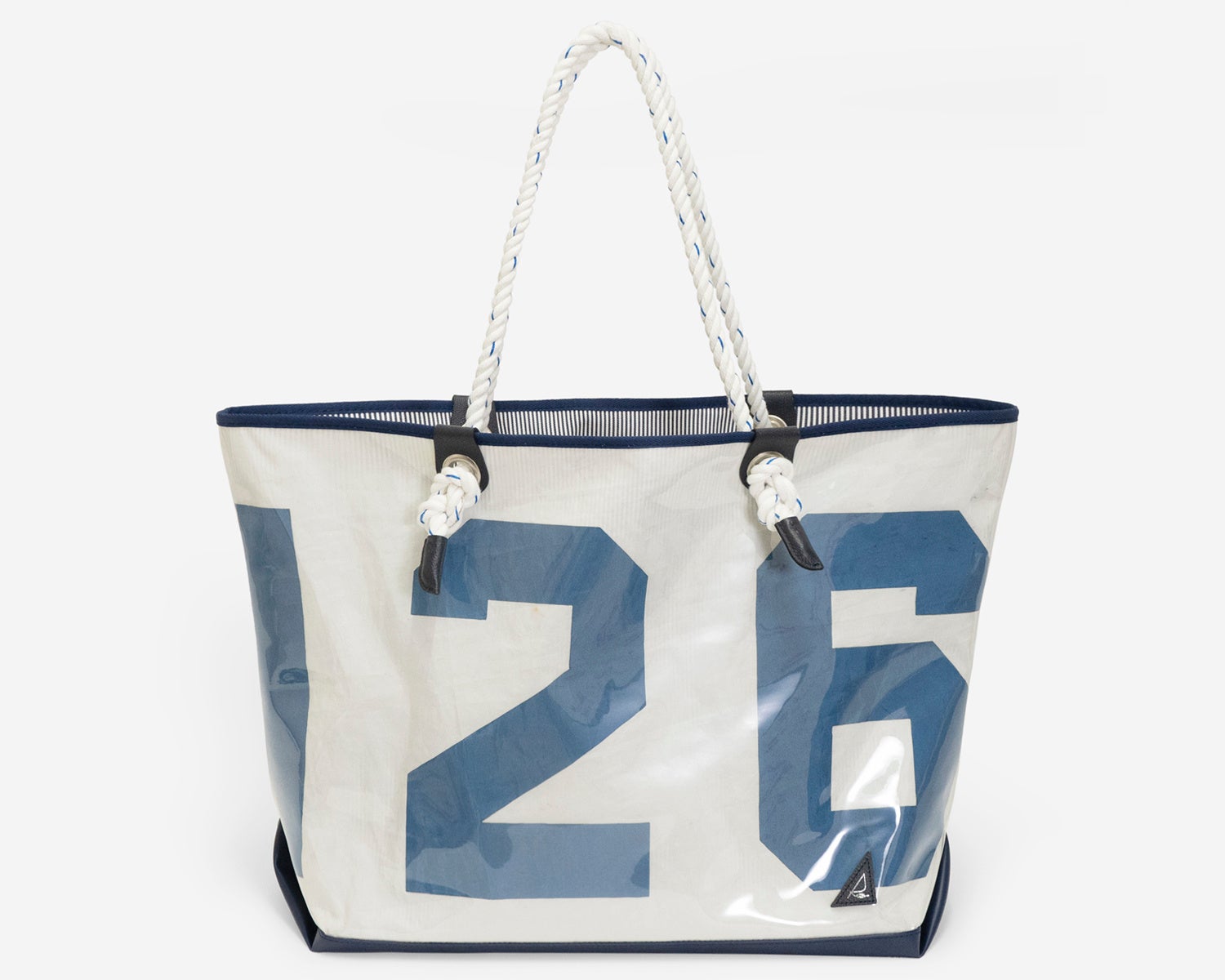 セイルとしてのプリントやステッチの痕跡をそのまま採用し、1点1点異なるデザインです。