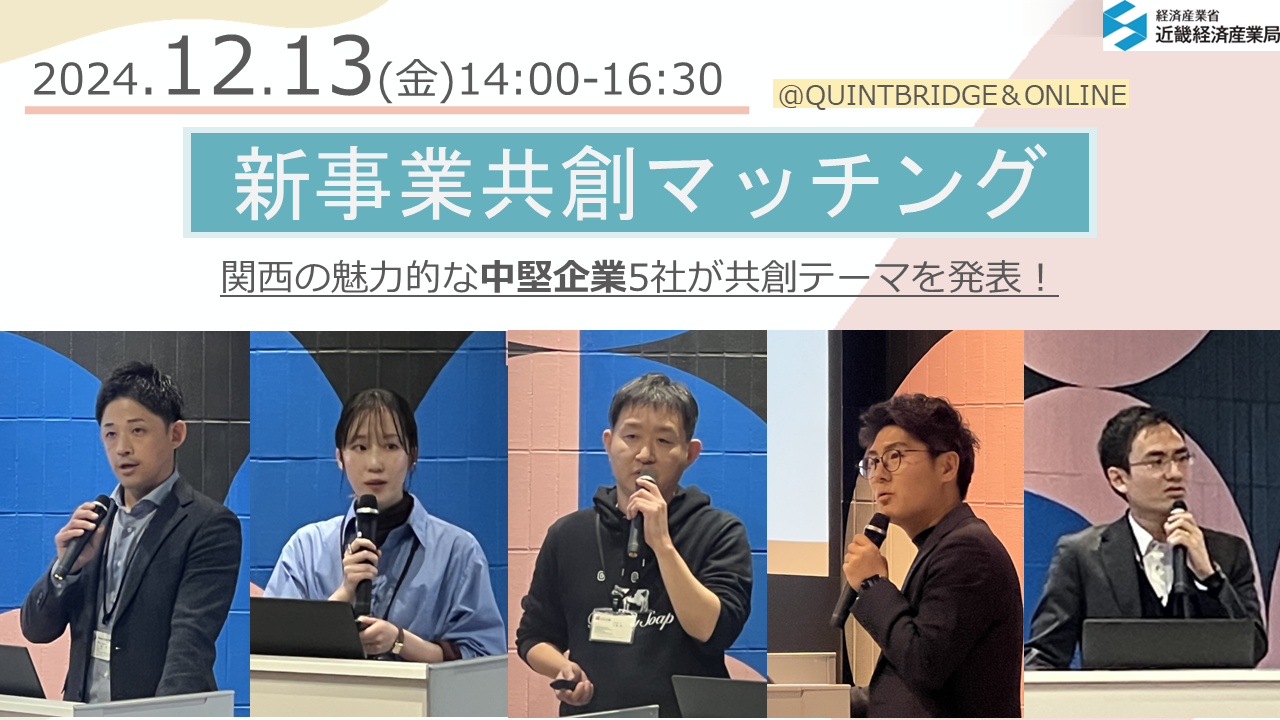 本イベントは、本年2月に開催した「新事業共創マッチング」の2回目となりますが、今回は、経済産業省が新たに定義した「中堅企業」の中から、成長志向の高い関西の中堅企業5社に共創テーマをご発表いただきました。