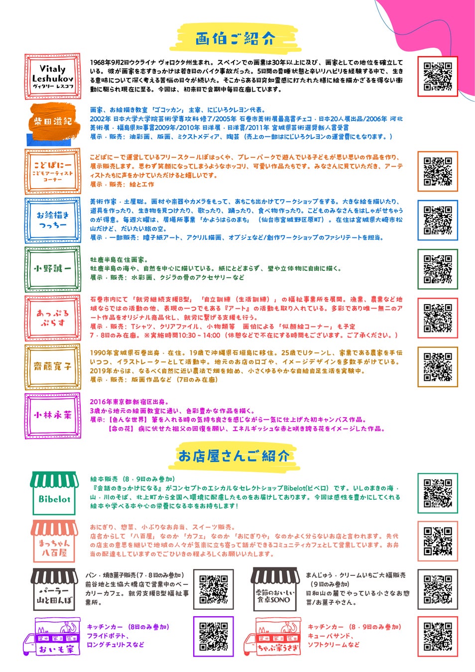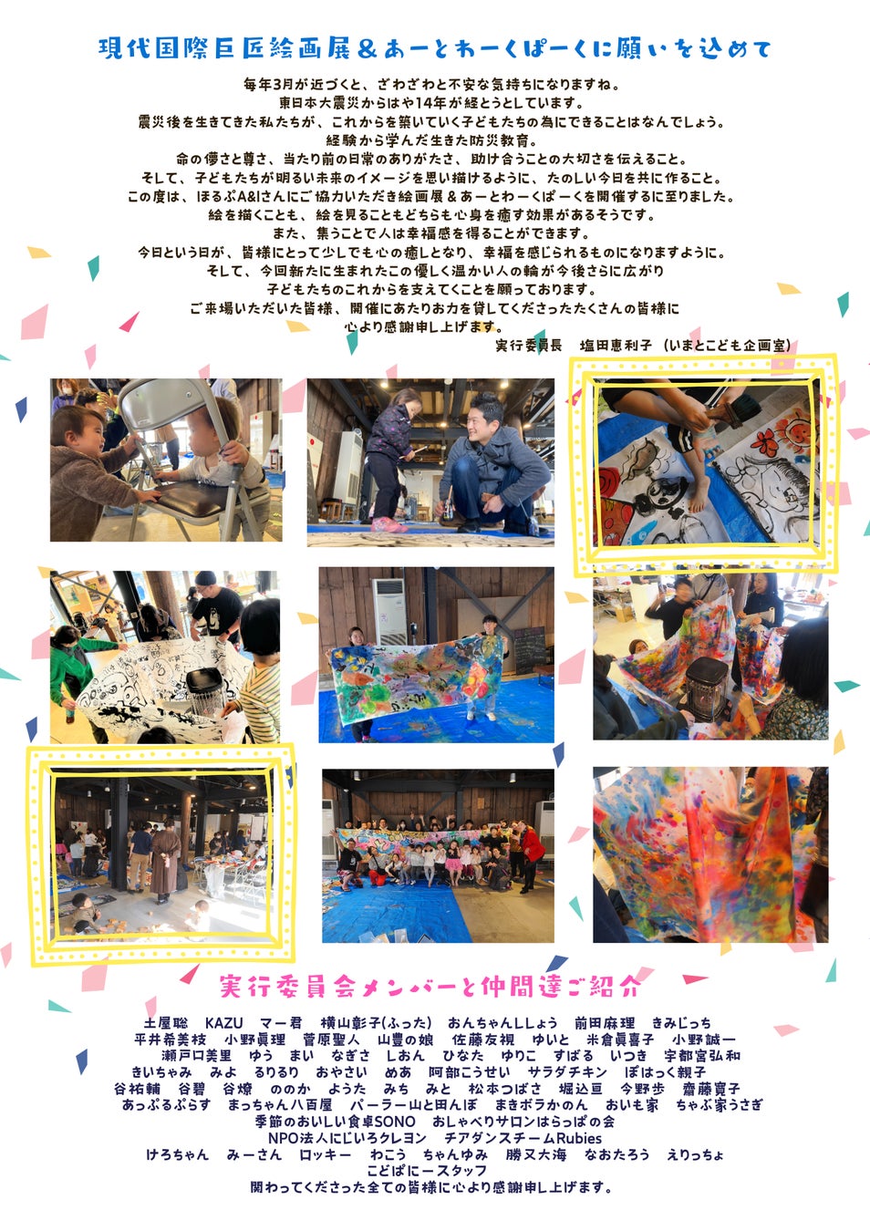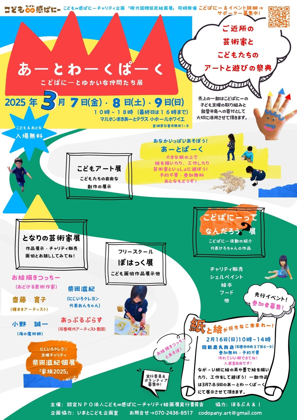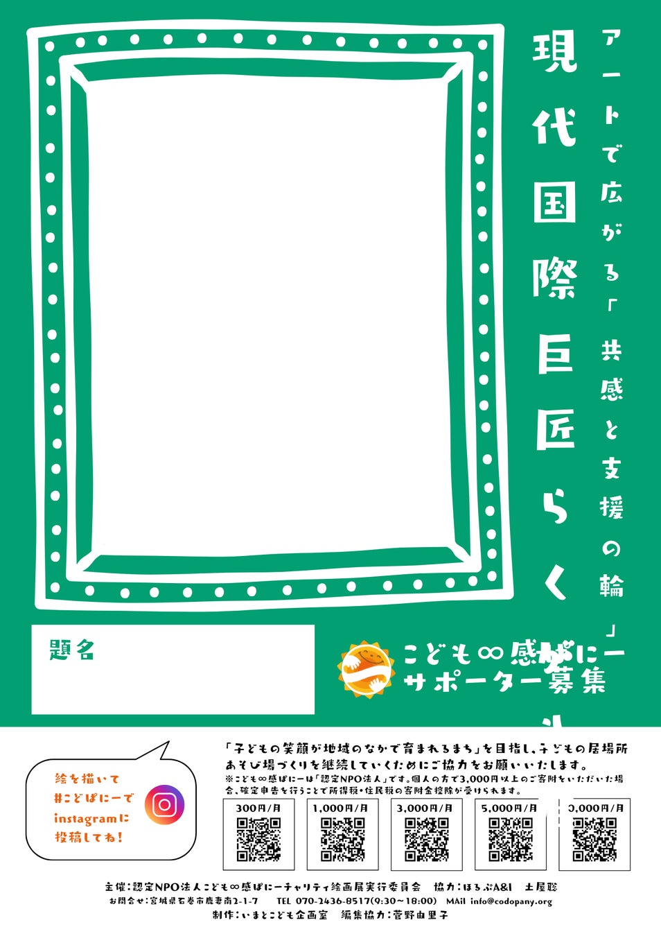 震災直後、「遊ぶ場所がない」という子どもたちの声から始まった活動は、プレーパークやフリースクールの運営を通じて、多くの子どもと地域の方々に支えられながら歩んできました。設立12年目の節目に開催する本チャリティ絵画展には、被災地・石巻から未来への希望を発信し、「かつて支援を受けた石巻だからこそ、今度は支援を届ける側に」との強い想いも込められています。