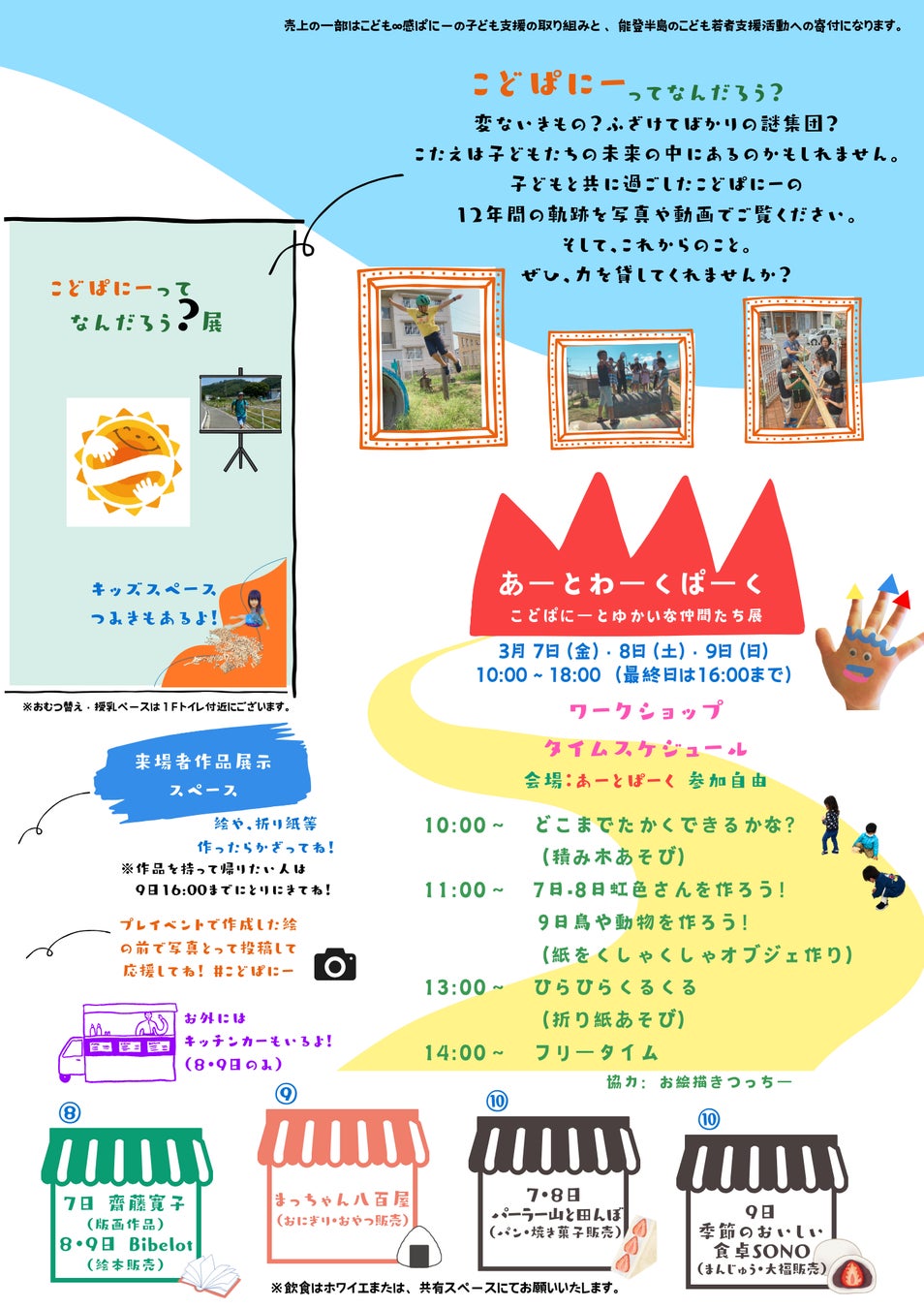 また、会期中(3/7~9)の取材も大歓迎です。事前にご連絡いただければ、こども達の制作ワークショップの様子や来場者の反応など、日時に応じた取材コーディネートをいたします。遠方メディア向けには、後日イベントレポートや写真素材の提供も検討しておりますので、ご希望がございましたらお申し出ください。