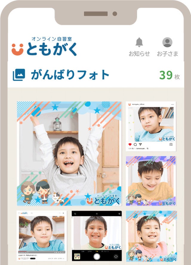 日々の『ともがく』での学習終了時に、オリジナルのフレームを選択して、自分のがんばった姿を撮影するのが「がんばりフォト」。写真はアルバム化されるので、お子さまの成長を実感できます。また、写真は保護者にも日々メールで共有されるので、帰宅が遅く、なかなか親子の時間が取りづらい保護者の方にも大好評の機能です。