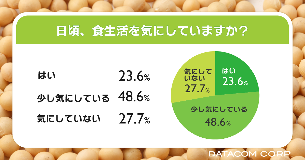 「日頃、食生活を気にしていますか?」という質問に対して、「はい」が23.6%、「少し気にしている」が48.6%となりました。20、30代の若い世代でも、7割以上の人が日頃から食生活に気を配っているという結果が出ました。