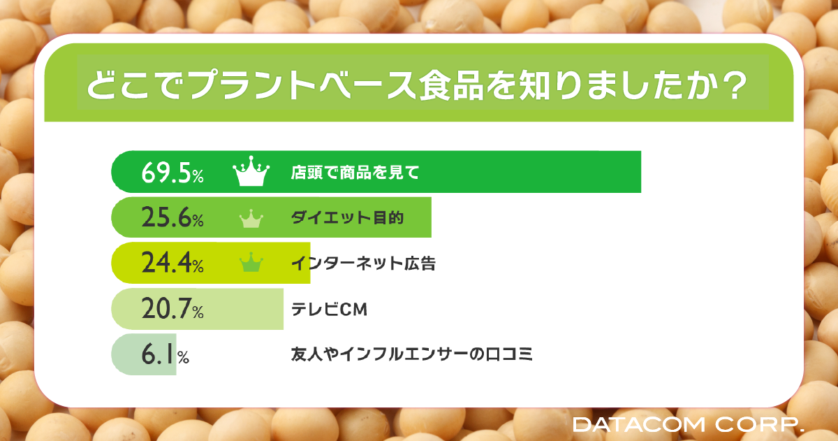 植物由来のプラントベース食品を知っていると回答した人に「どこでプラントベース食品を知りましたか?(複数回答可)」と質問した所、1位が「店頭で商品を見て」で69.5%、2位の「ダイエット目的」が25.6%、3位が「インターネット広告」で24.4%となりました。テレビCMやインターネット広告への露出が少ない中で、店頭に並んでいる商品を見て初めて知るという人が多いようです。
