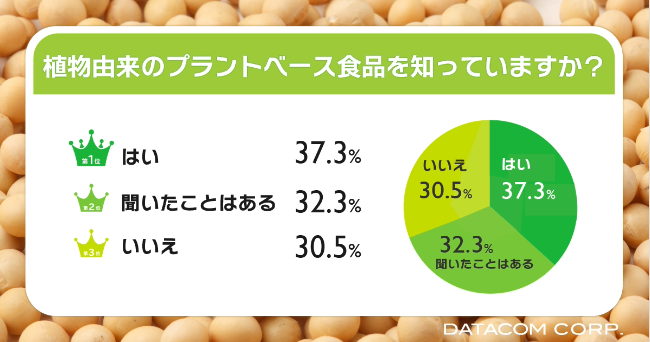 「植物由来のプラントベース食品を知っていますか?」という質問に対して、1位「はい」が37.3%、2位「聞いたことはある」が32.3%、3位「いいえ」が30.5%という結果になりました。