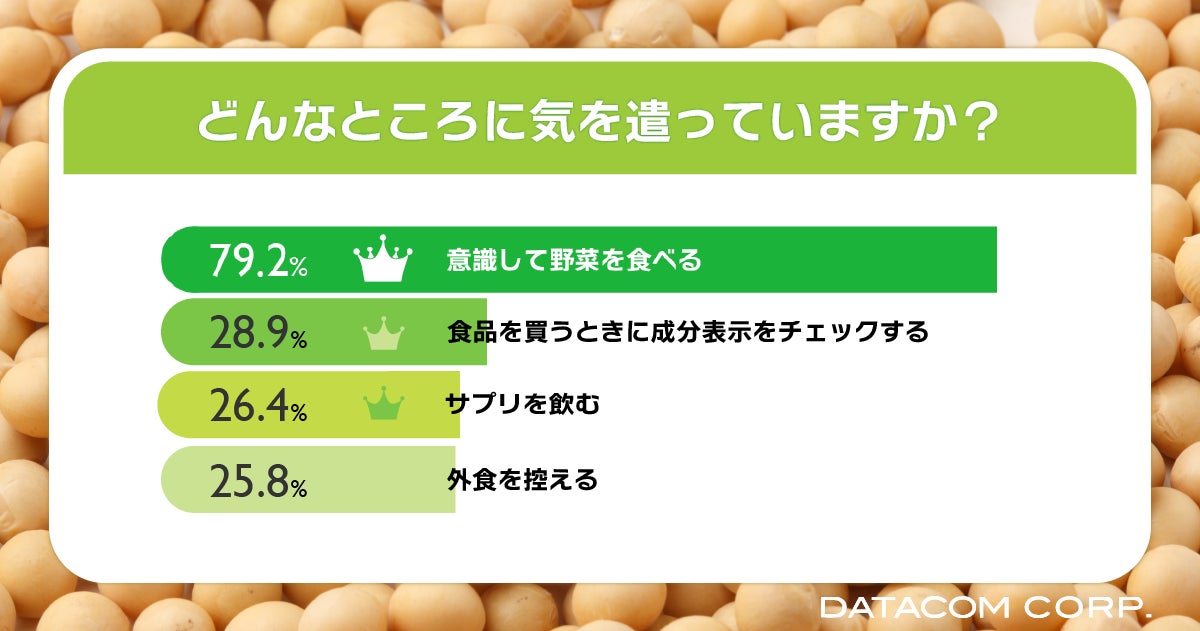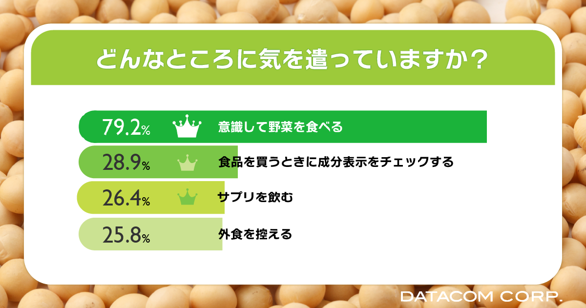 食生活を気にしている、または少し気にしていると回答した人に「どんなところに気を遣っていますか?(複数回答可)」と聞いた所、「意識して野菜を食べる」という回答が79.2%と他に大差をつけて1位となりました。まずは、気軽に始められるところから食生活に気を配る人が多いようです。