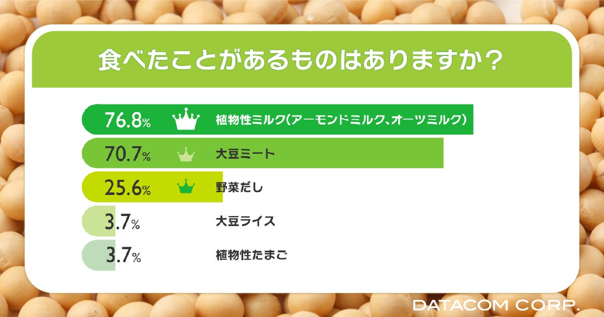 植物由来のプラントベース食品を知っていると回答した人に、「食べたことがあるものはありますか?(複数回答可)」と聞いた所、「植物性ミルク」が76.8%で1位、2位の「大豆ミート」が70.7%と続きました。3位が「野菜だし」で25.6%と差が開きました。