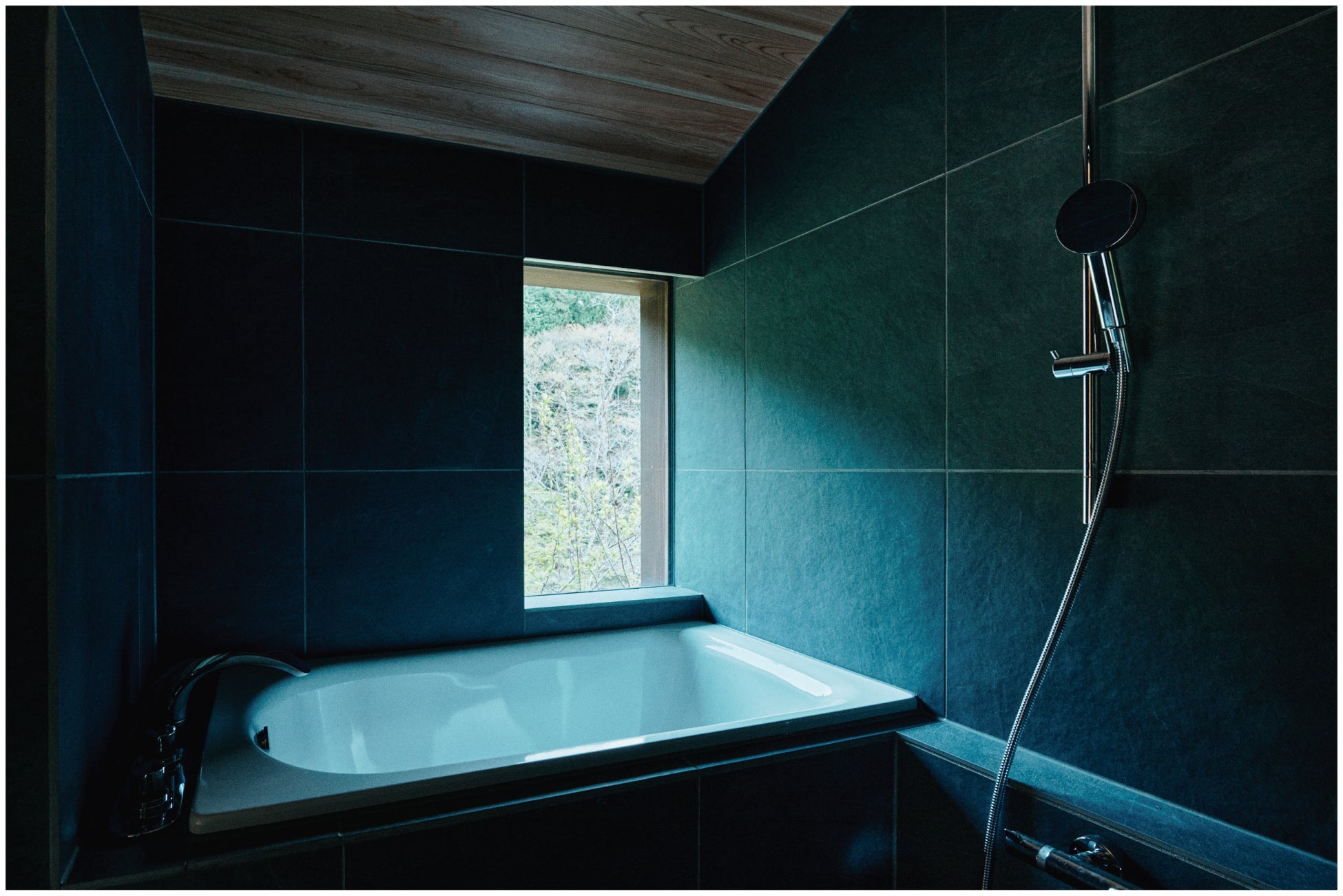 部屋のお風呂では、窓の外の自然を眺めてゆっくりとリラックスした入浴をお楽しみいただけます。また、直接テラスにも出られるようになっており、多摩川の流れを聞きながら自然を感じる時間を過ごすことができます。その後は快適かつ、スタイリッシュに見えるシルエットを念頭にデザインされた、オリジナルの滞在着に着替えて、心身を奥多摩モードに。