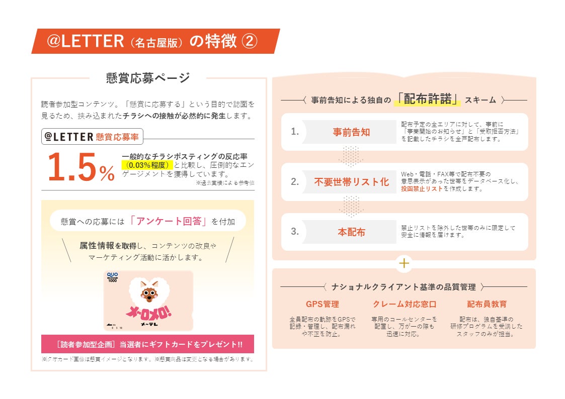 メ~テレの番組連動コンテンツを盛り込み、名古屋エリアの生活者が貰って嬉しくなるレターとして機能。通常のポスティングにはない興味と共感を醸成し、リビングでの保存性向上を目指します。