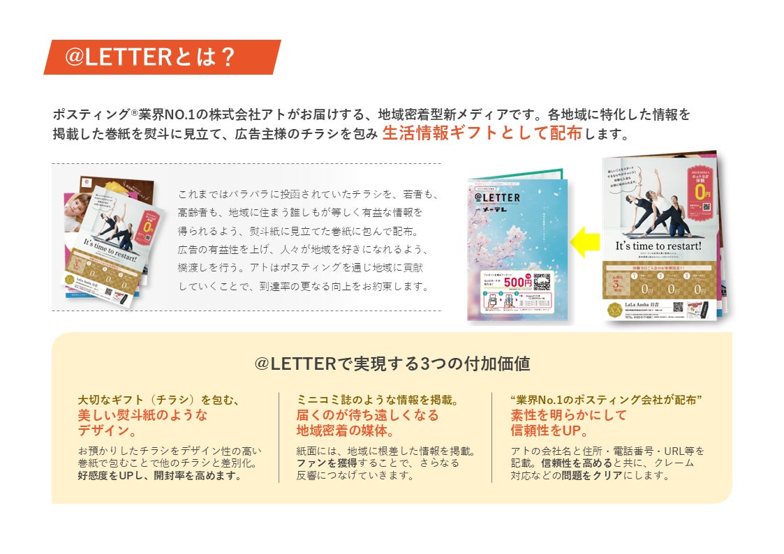 ポスティング®業界NO.1(※1)の株式会社アトがお届けする、地域密着型新メディアです。各地域に特化した情報を掲載した巻紙を熨斗に見立て、広告主様のチラシを包み生活情報ギフトとして配布します。
