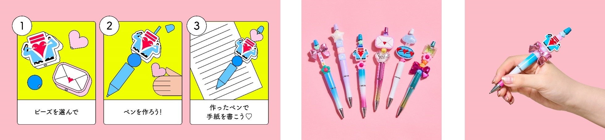 今回の第3弾では、過去の開催で好評だった、会場限定デザイン切手をガチャでゲットできる「ズッキュン♡切手ガチャ」、かわいいワッペンを自分らしく組み合わせる「ぺたぺた♡ワッペン」などのほか、新コンテンツとして好きなビーズを組み合わせて自分だけのペンが作れる「ときめき♡レターペン」が登場します。