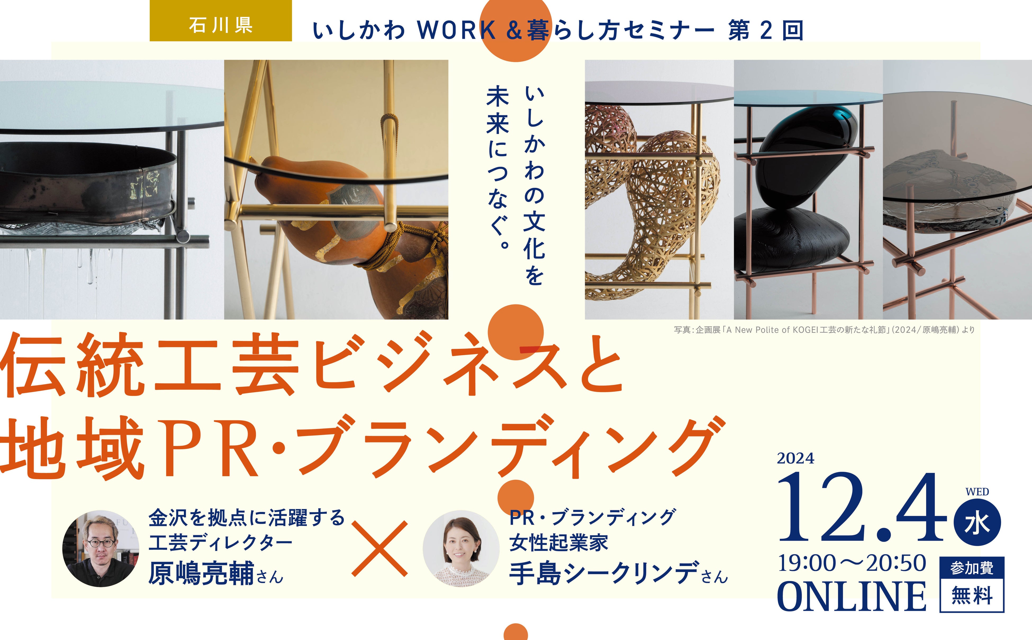 本セミナーは、「いしかわの文化を未来につなぐ。」をテーマに、工芸とビジネスを繋げる工芸ディレクターと作品の魅力を発信するプロフェッショナルが、クリエイターとPR・ブランディングの双方の視点から語り合うトークイベントです。「伝統工芸を暮らしに活かすには?」「どうしたら仕事やビジネスにつながる?」「地域の伝統文化を世界に発信していくには?」といった疑問にお答えするほか、石川県への移住や起業に関心がある方への情報提供、ゲストによる石川県のおススメ情報や交流会など、盛りだくさんの内容でお届けします。